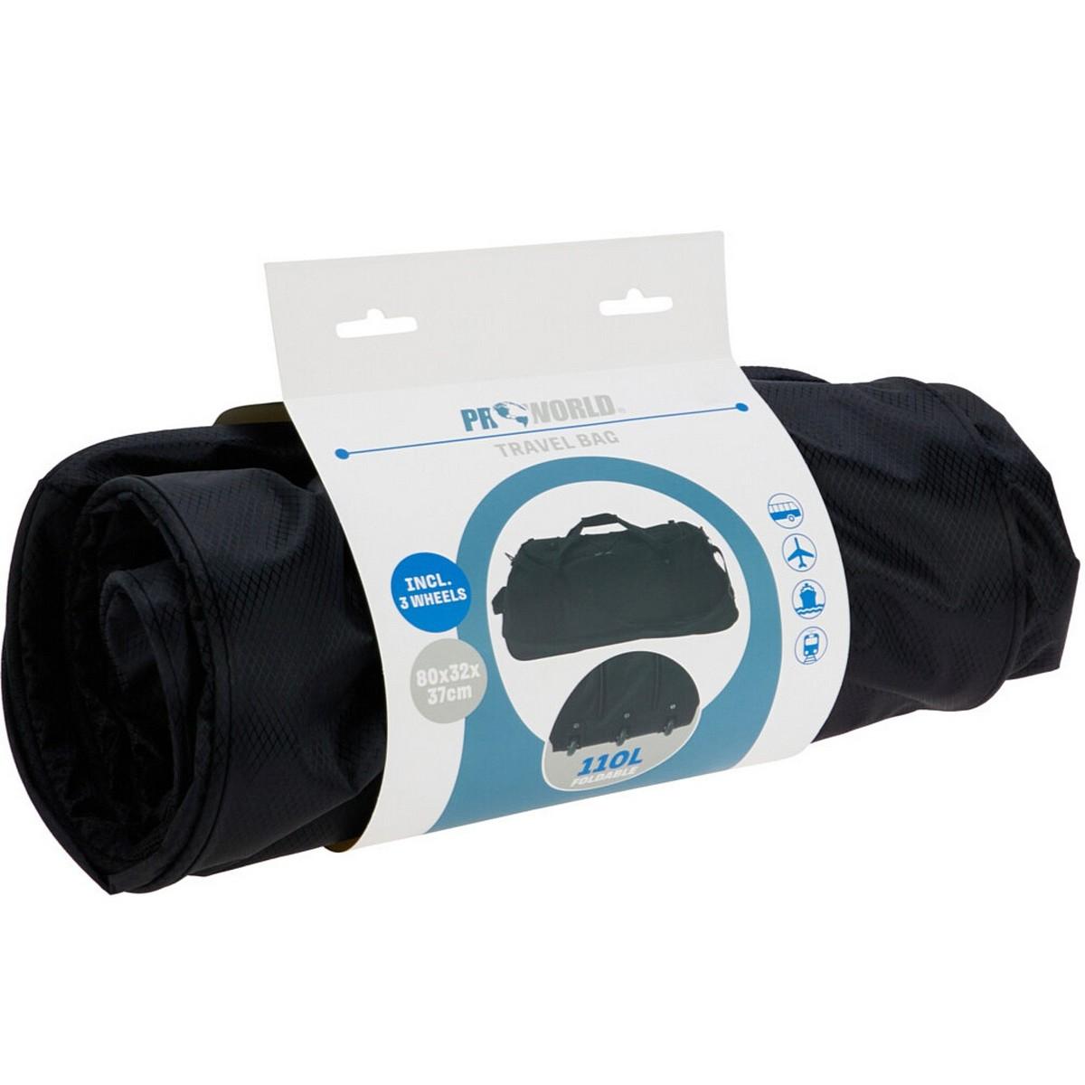 ДОРОЖНАЯ СУМКА 110 Л ЧЕРНАЯ, ПОЛИЭСТЕР РИБСТОП, ЧЕРНАЯ МОЛНИЯ, ЭЛАСТИЧНЫЙ ШНУРОК С КРУГЛЫМ ШНУРКОМ СВЕРХУ, 2 СЕТЧАТЫХ БОКОВЫХ КАРМАНА С 1 СТОРОНЫ, 2 ЧЕРНЫЕ РУЧКИ С ПАРОЙ СВЕРХУ И 1 СБОКУ С ПОДКЛАДКОЙ НА ЛИПУЧКЕ В ТОН ТКАНИ, 1 РЕГУЛИРУЕМЫЙ ЧЕРНЫЙ ПЛЕЧЕВОЙ РЕМЕНЬ, ВНУТРЕННЯЯ ОБОЛОЧКА, ЧЕРНАЯ ВЕРЕВКА/ПАРА ДЕТАЛЕЙ СБОКУ, 3 КОЛЕСА, ЛОГОТИП PROWORLD СБОКУ, КАЖДЫЙ С БУМАЖНЫМ РУКАВОМ/ 395X185X120 ММ,
