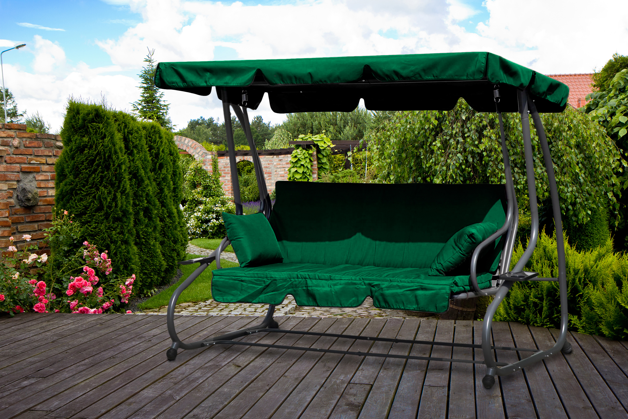 Качели садовые кабриолет, 3-местные, 2-в-1, подушки, зеленые, MultiGarden