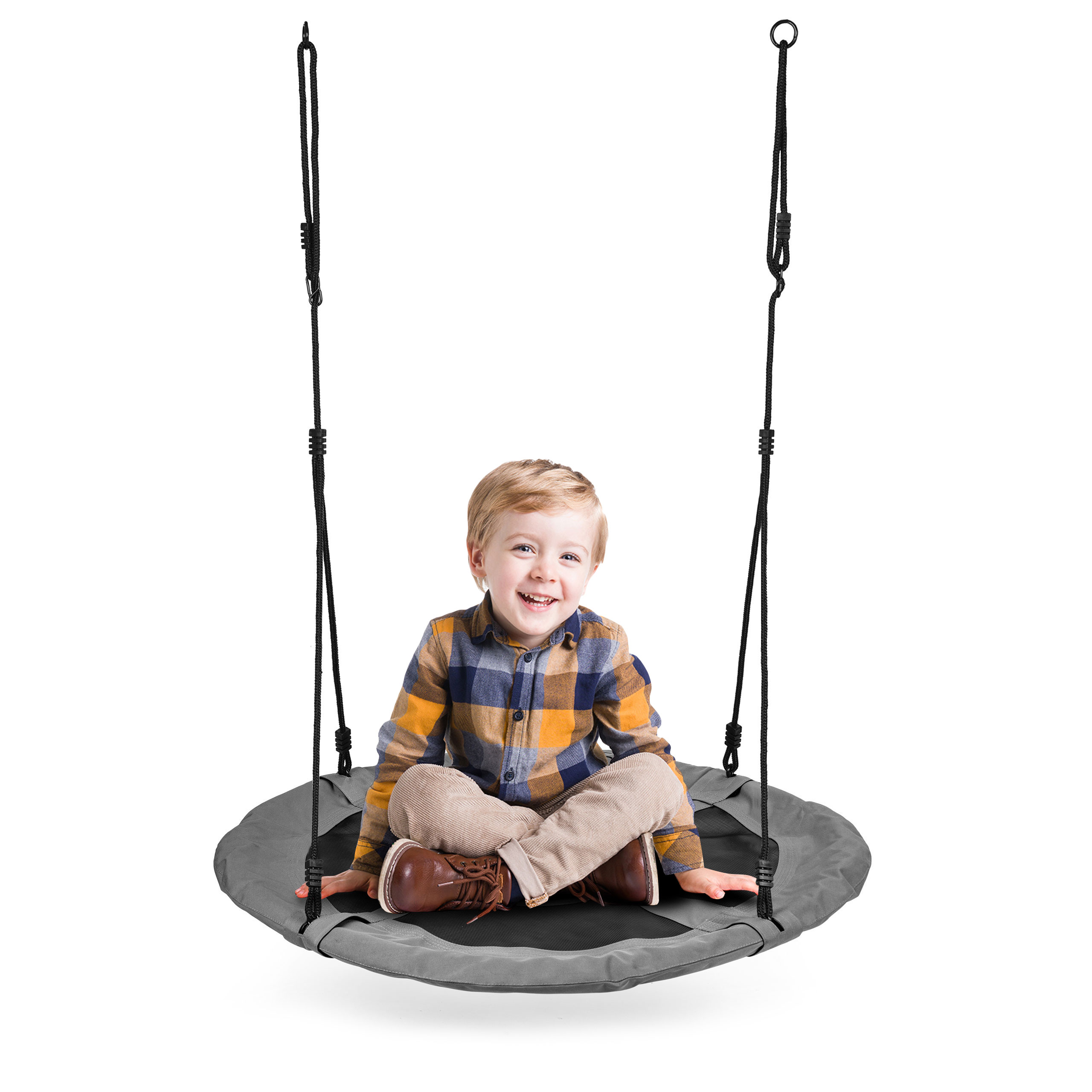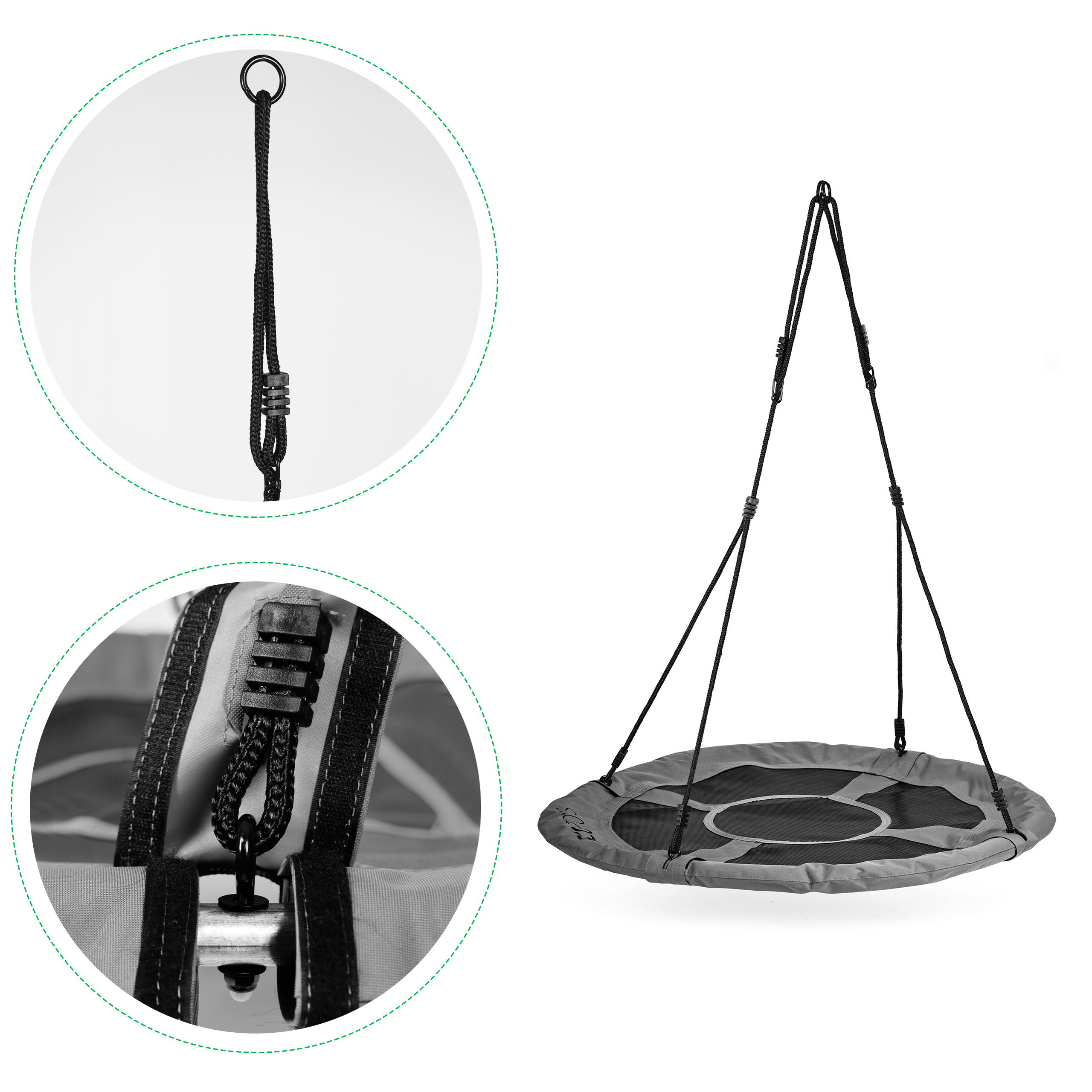 • Качели оснащены 2 регулируемыми тросами толщиной 10 мм из прочного материала и удобным сиденьем диаметром 100 см с поролоновой обивкой, обеспечивающим безопасность и комфорт. Тросы оснащены металлическими кольцами для крепления, что делает качели очень простыми в установке. Вы можете повесить их на раму качелей или на ветку дерева.