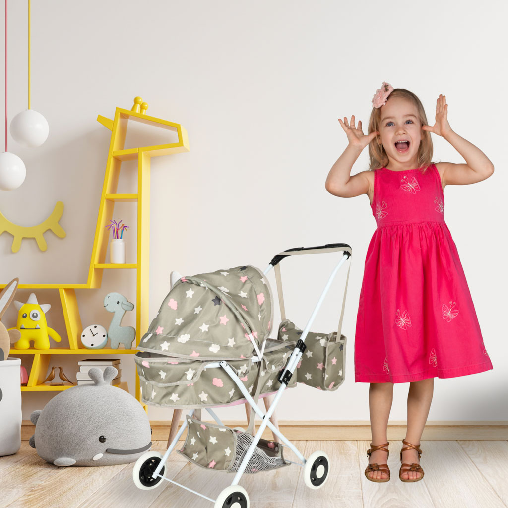 Эта модель не просто игрушечная коляска — это полноценный комплексный продукт. Помимо уже упомянутой сумки через плечо и полочки для мелких вещей, коляска оснащена колесами из пенопласта, которые не шумят и не царапают пол, делая игры дома спокойными и приятными. Складная конструкция облегчает хранение и транспортировку, например, на каникулы или к бабушке с дедушкой, а благодаря правильно отрегулированной высоте ручки ребенок сможет легко управлять коляской.