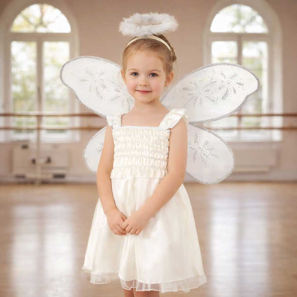 комплект из трех предметов — состоит из белого платья, повязки на голову и крыльев с блестками