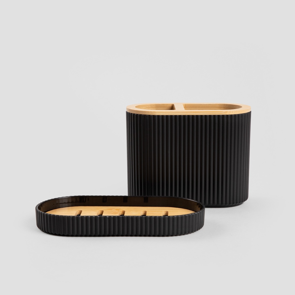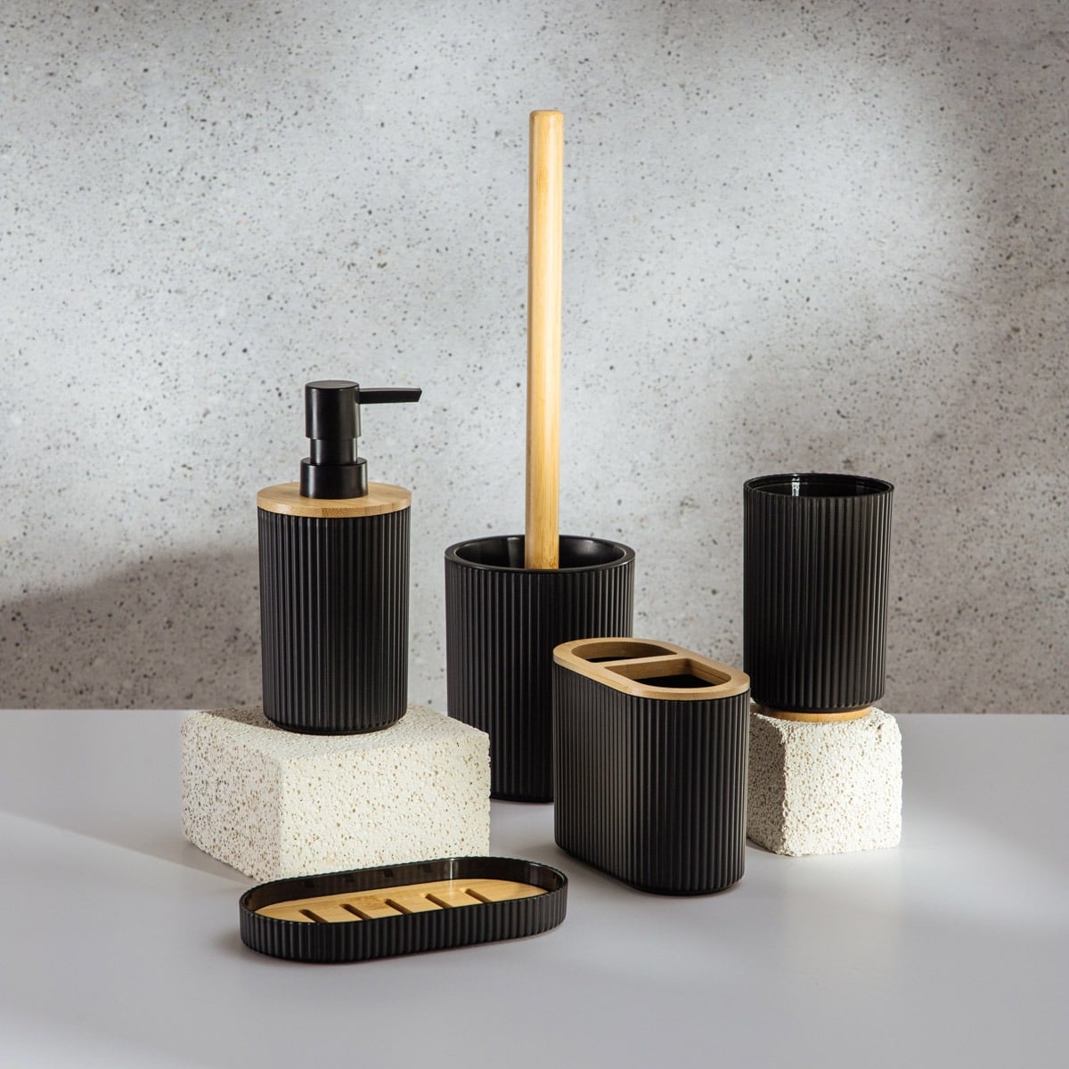 В набор входят дозатор для жидкого мыла, стакан, мыльница с желобками для слива, держатель для зубных щеток и туалетная щетка с бамбуковой ручкой. Каждый предмет отличается не только функциональностью, но и декоративностью. Это идеальный выбор для ванных комнат в стиле модерн, лофт или минимализм.
