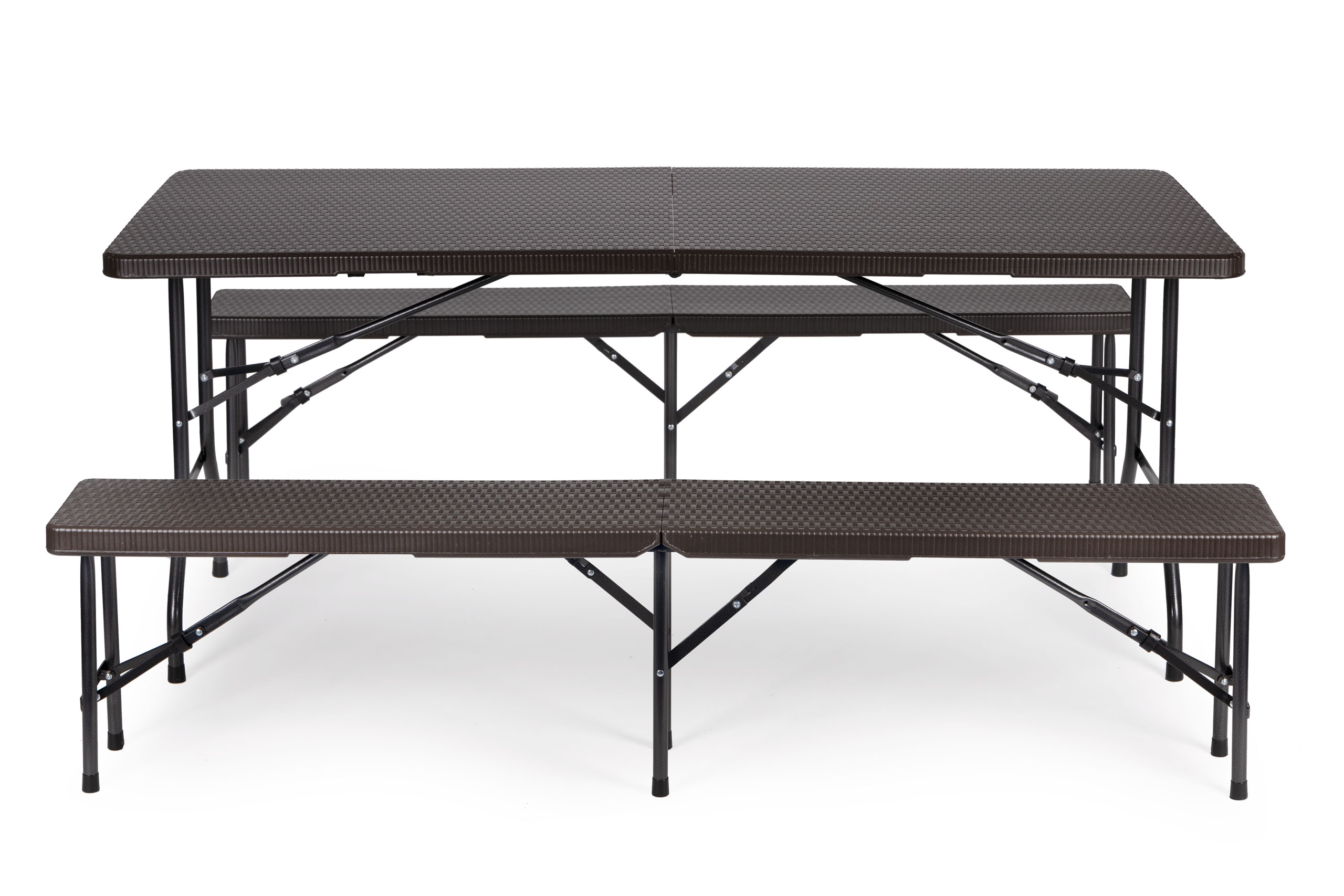 Комплект рассчитан на 8 человек, высота скамеек и стола подобрана таким образом, чтобы комплект гарантировал комфорт и удобное положение во время встреч на свежем воздухе. Возможность складывания мебели в чемоданы позволит вам сэкономить место при хранении, а также облегчит транспортировку.