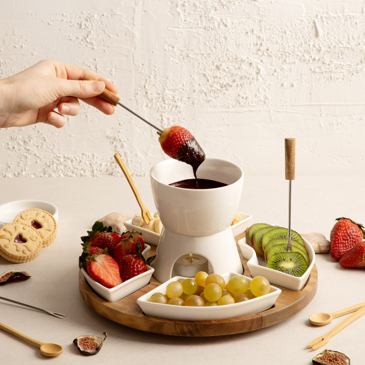Благодаря вращающемуся основанию каждый гость может легко сдвинуть чашу с выбранными им закусками — кусочками мяса, вареными овощами, гренками или, в случае шоколадного фондю, клубникой, виноградом или сухофруктами. В подогревателе есть углубление для стабилизации зажженной чайной лампы, все блюда лежат в специальных углублениях и не двигаются при вращении подноса.