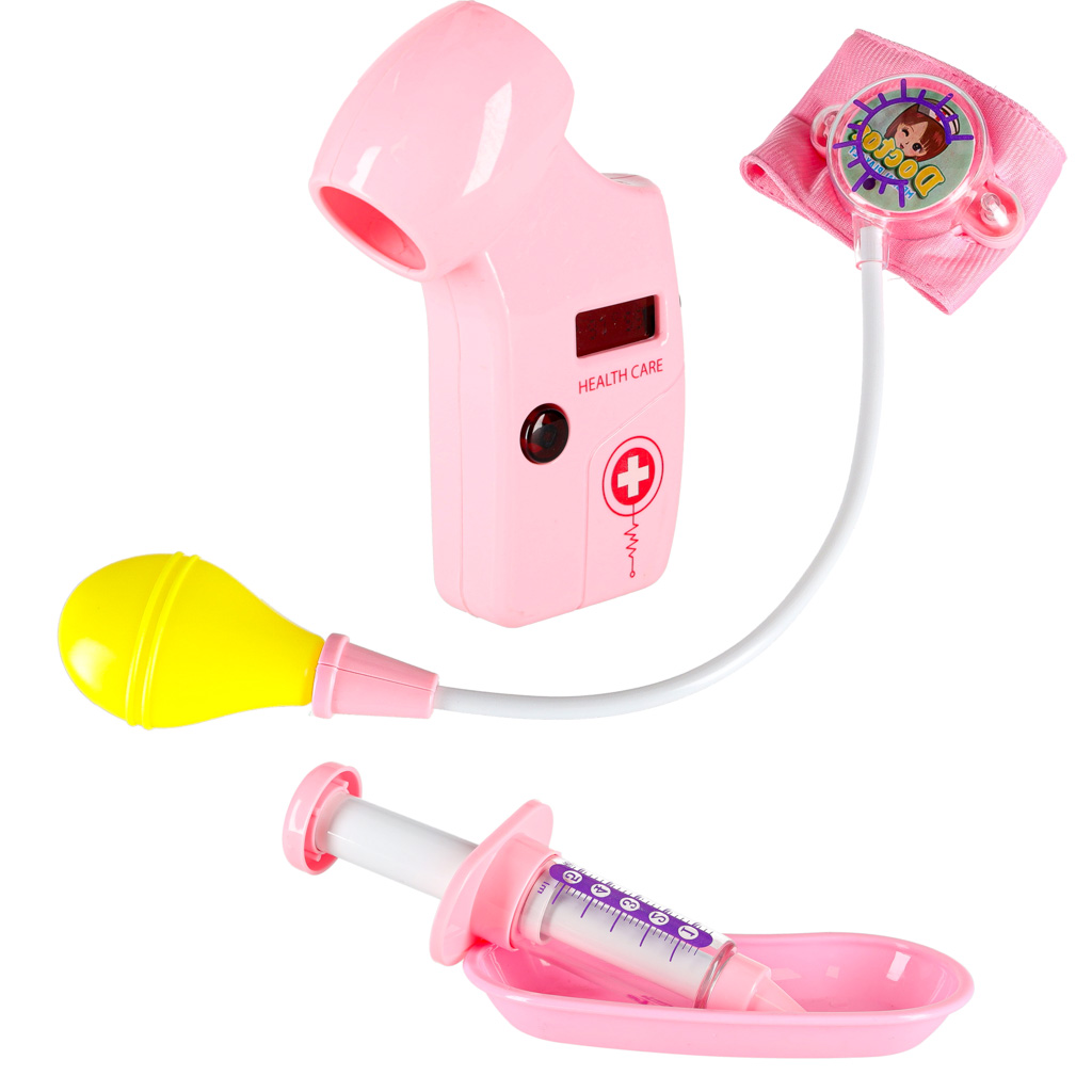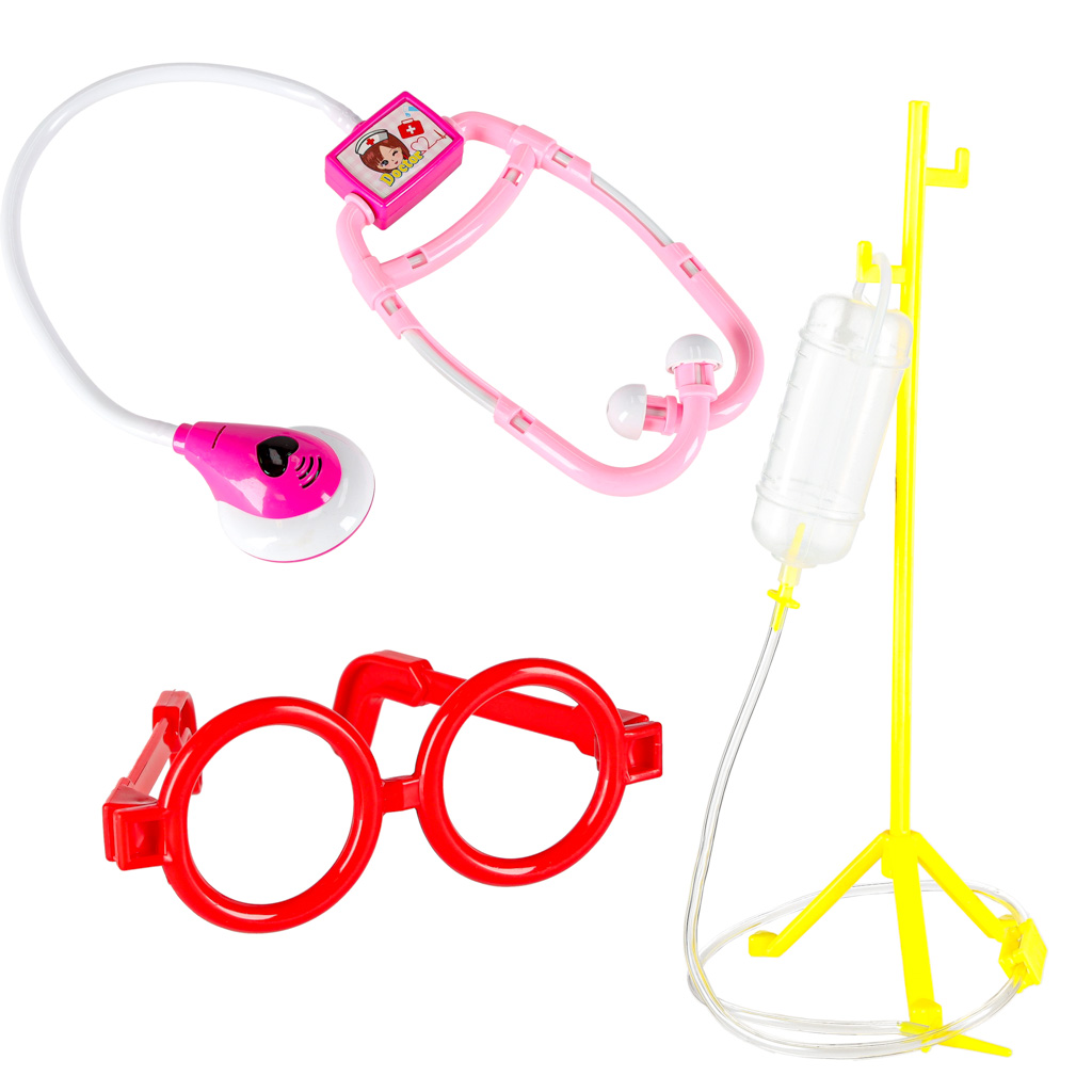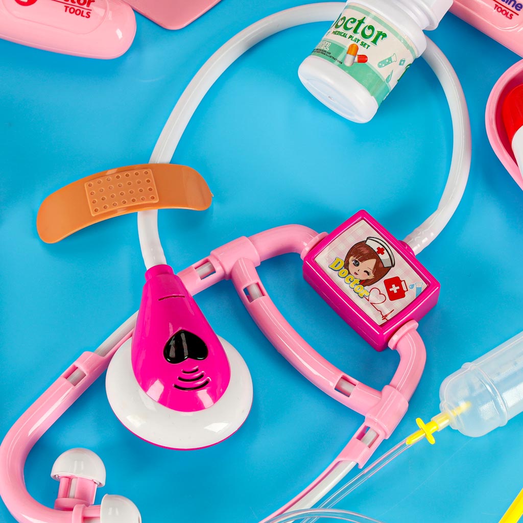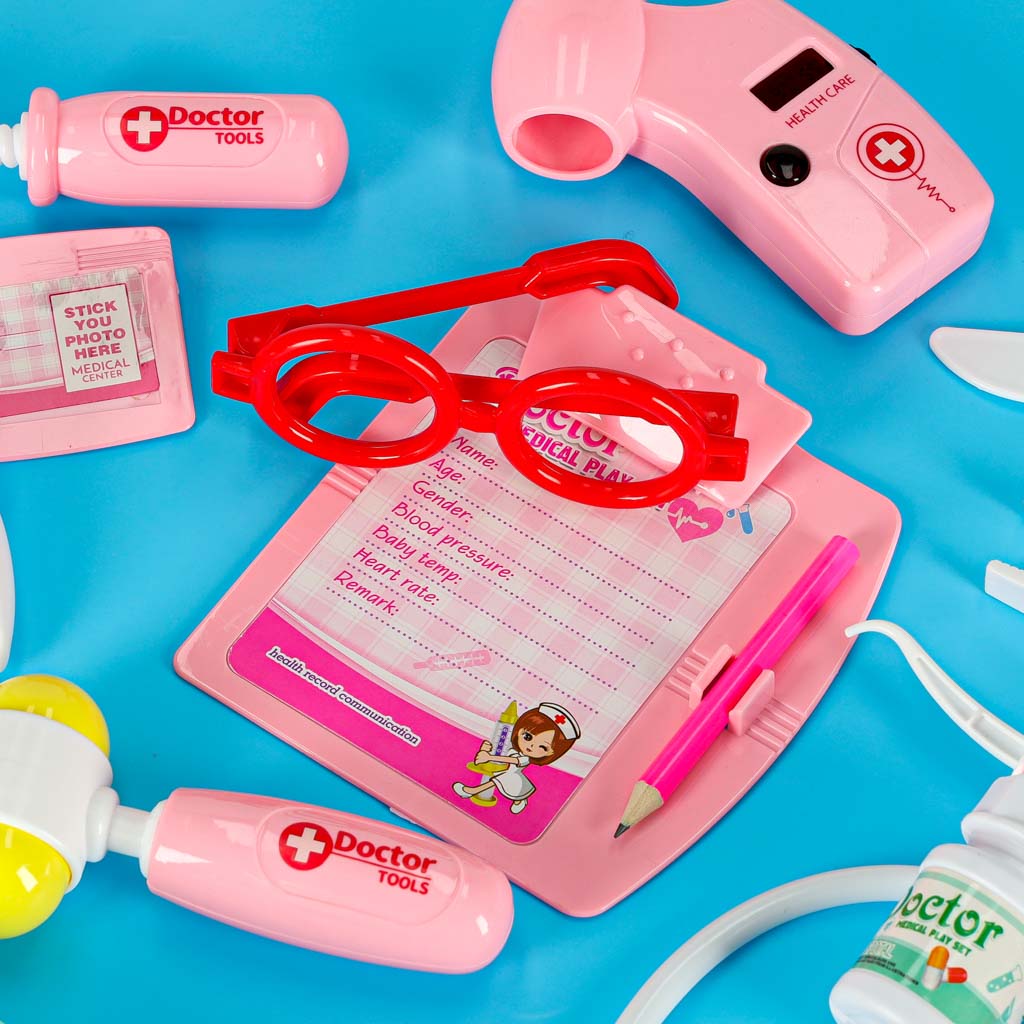 Во время игры ребенок может разыгрывать сценки из врачебной практики или больницы, раздавая игрушечные лекарства пациентам, накладывая повязки, делая уколы или подключая капельницу. С помощью игрушек на батарейках малыш может послушать сердцебиение стетоскопом, заглянуть в ухо отоскопом или измерить пульс пульсоксиметром. Блокнот с зажимом и карандашом позволяет разместить тетрадь, в которой ребенок будет делать записи о пациентах.