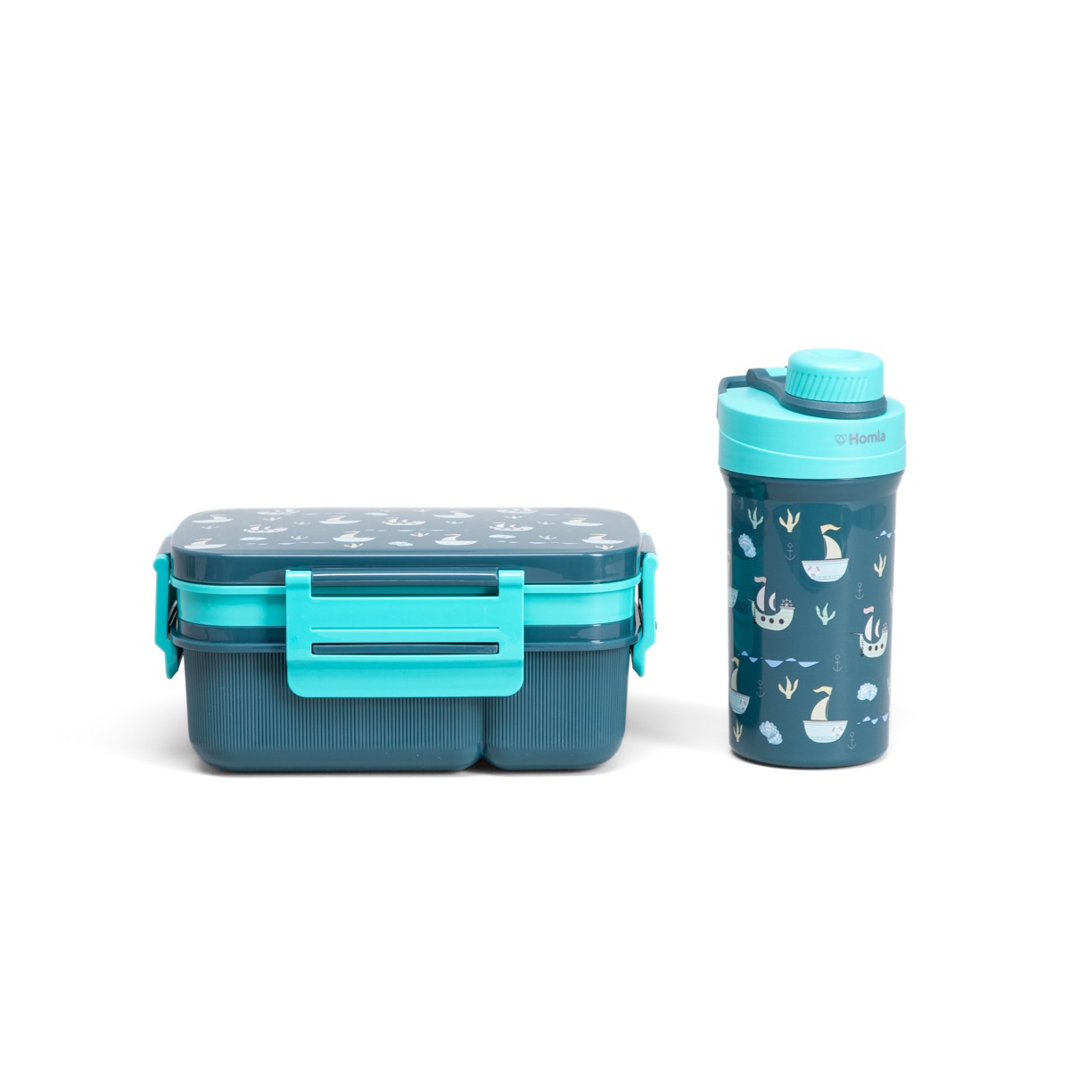 Ланчбокс объемом 1,8 литра вмещает полноценный обед и закуски — идеальный вариант для школы, поездки или пикника. Кружка объемом 0,5 литра с завинчивающейся крышкой позволяет взять с собой любимый напиток, воду или сок без риска пролить. Набор имеет компактные размеры, что значительно облегчает его хранение и транспортировку, а герметичные крышки защищают содержимое.
