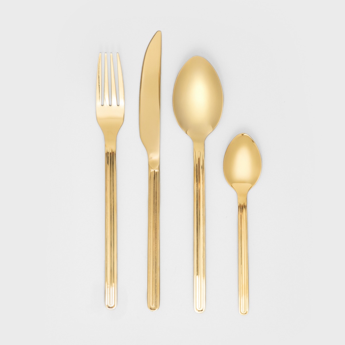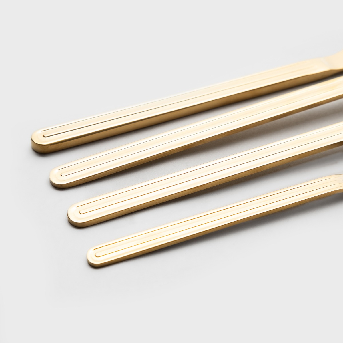 Набор столовых приборов ROOTS поможет вам создать очень стильную сервировку стола. Это идеальный выбор для тех, кто ценит утонченную эстетику. Золотые столовые приборы с тонким декором в виде полосок поражают своей простотой и элегантностью.