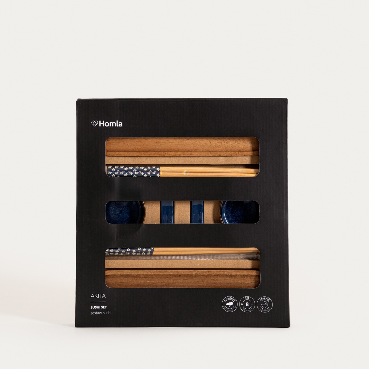 Набор для суши AKITA с темно-синими мисками и досками из акации 8 эл. КОНТАКТ С ПИЩЕЙ — ДА (Только керамические элементы можно мыть в посудомоечной машине) В набор входят 2 доски из акации 25x6x1,2 см, две подставки для палочек, два набора палочек для еды, две миски 7×3,3 см.