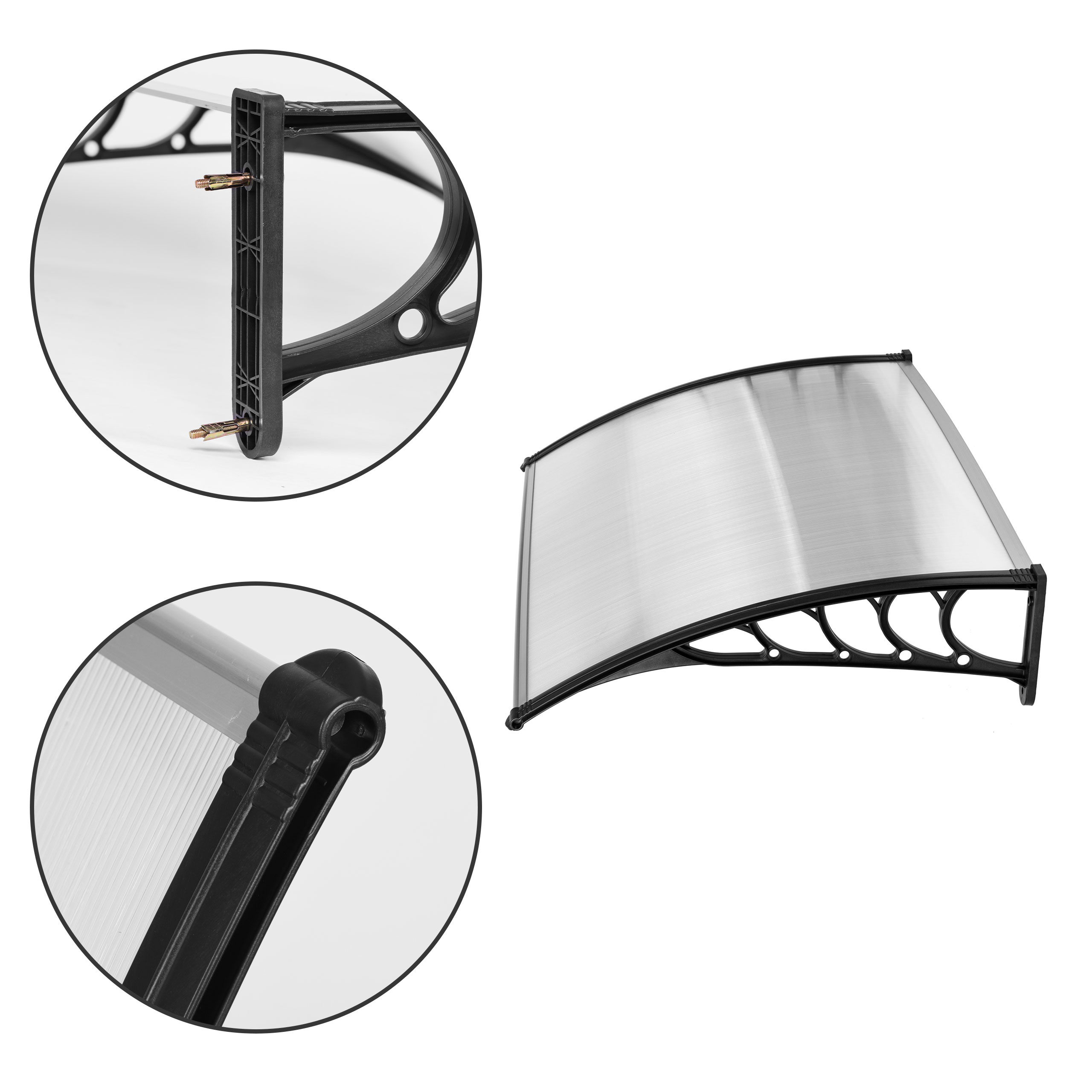 • Боковые элементы, поддерживающие всю конструкцию, изготовлены из прочного материала, что делает ее устойчивой к сильным порывам ветра. Навес крепится к фасаду с помощью 4 винтов, входящих в комплект.