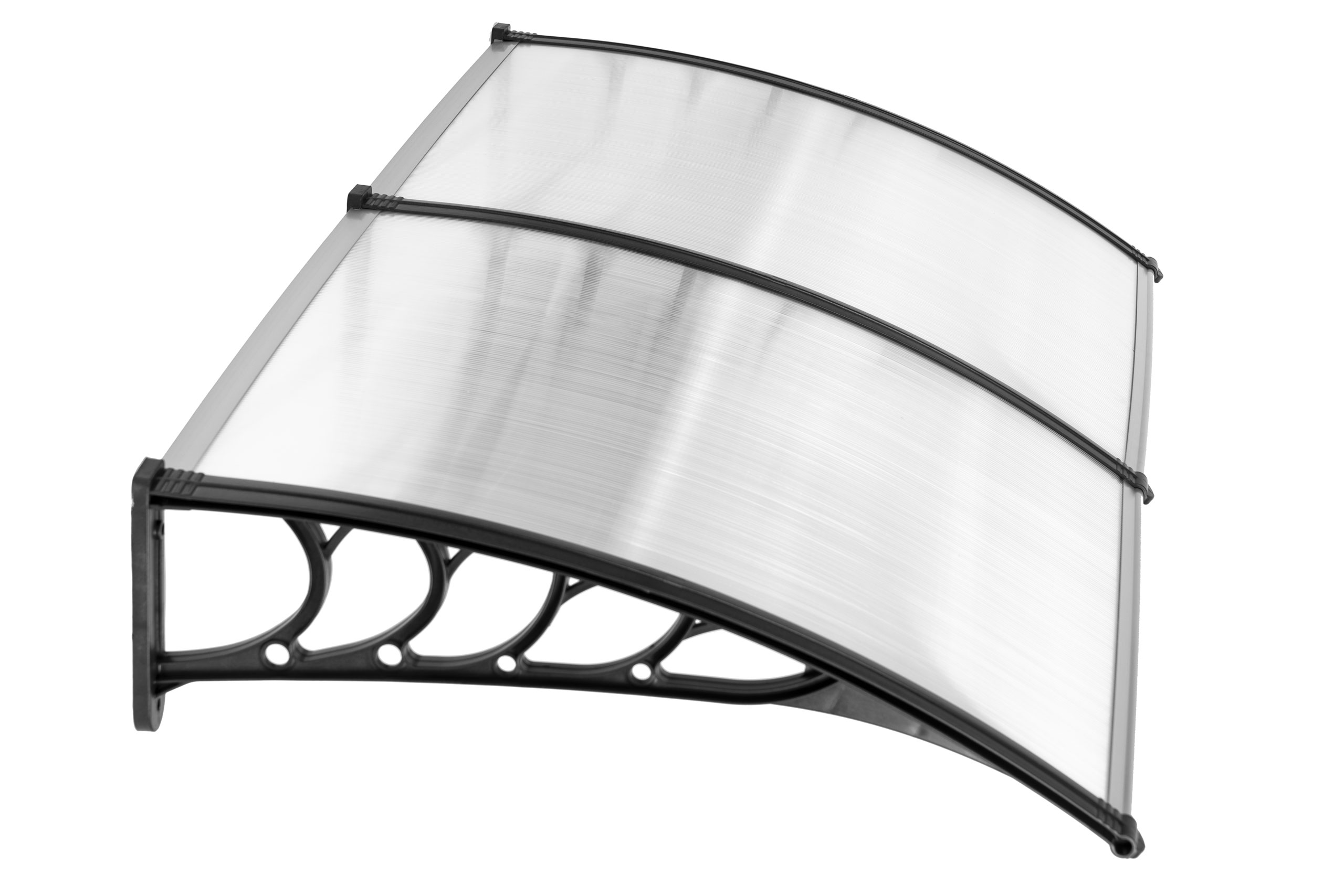 • Боковые элементы, поддерживающие всю конструкцию, изготовлены из прочного материала, что делает ее устойчивой к сильным порывам ветра. Навес крепится к фасаду с помощью 6 винтов, входящих в комплект.