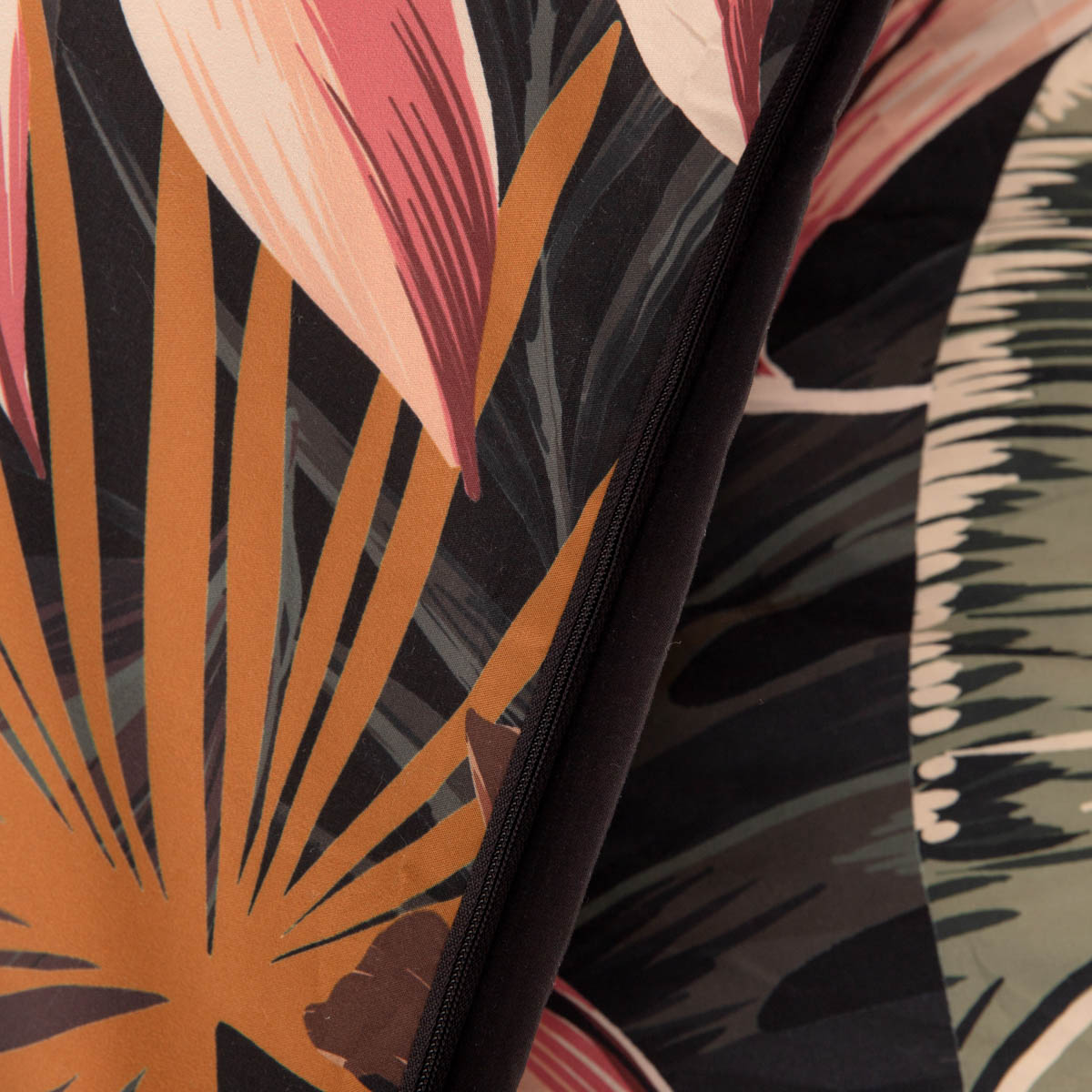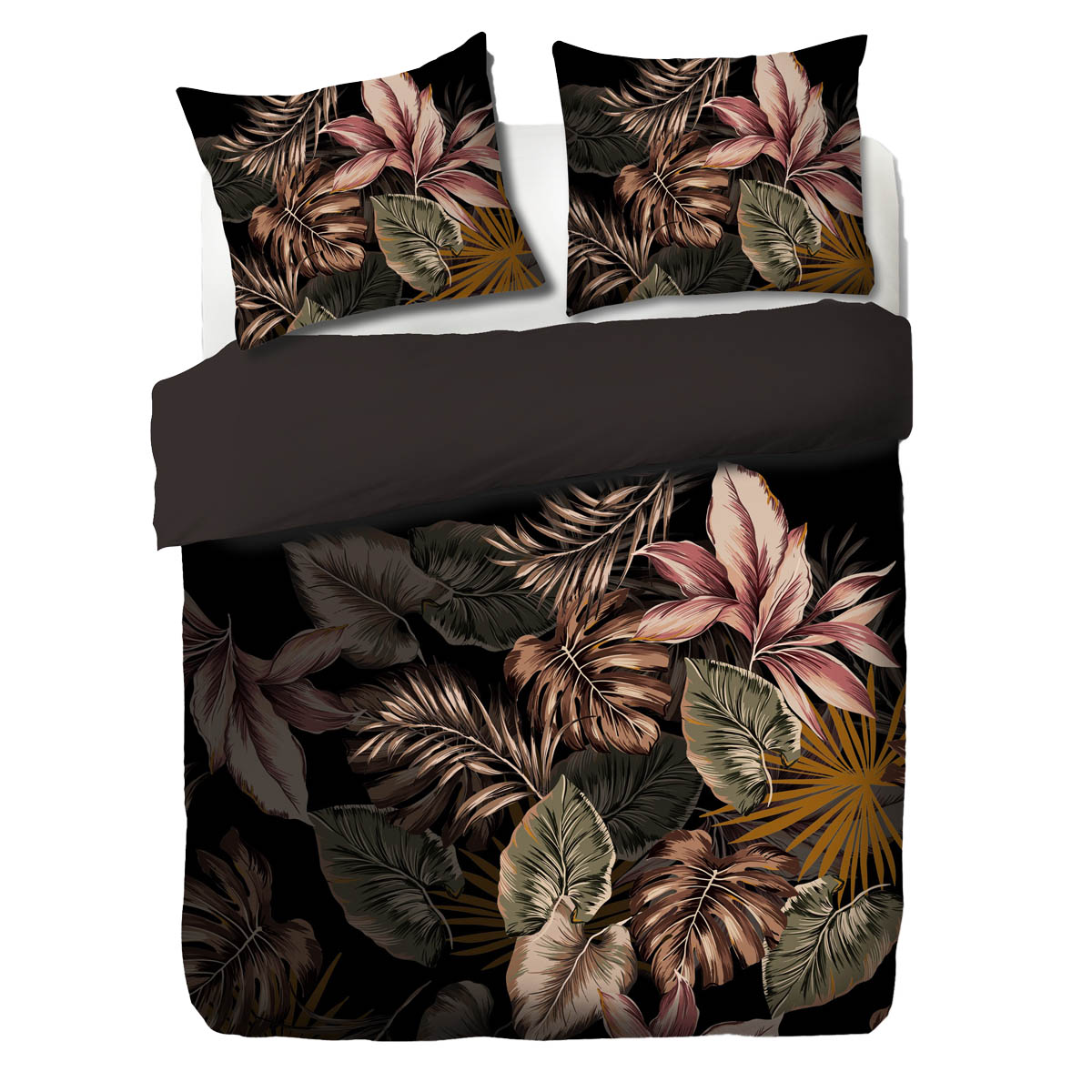 Комплект постельного белья FONCE состоит из подушки размером 160 x 200 см и двух наволочек размером 70 x 80 см. На черном фоне постельного белья изображены огромные экзотические листья. Цветочный мотив выдержан в приглушенных тонах зеленого, красного и оранжевого. Постельное белье застегивается на молнию.