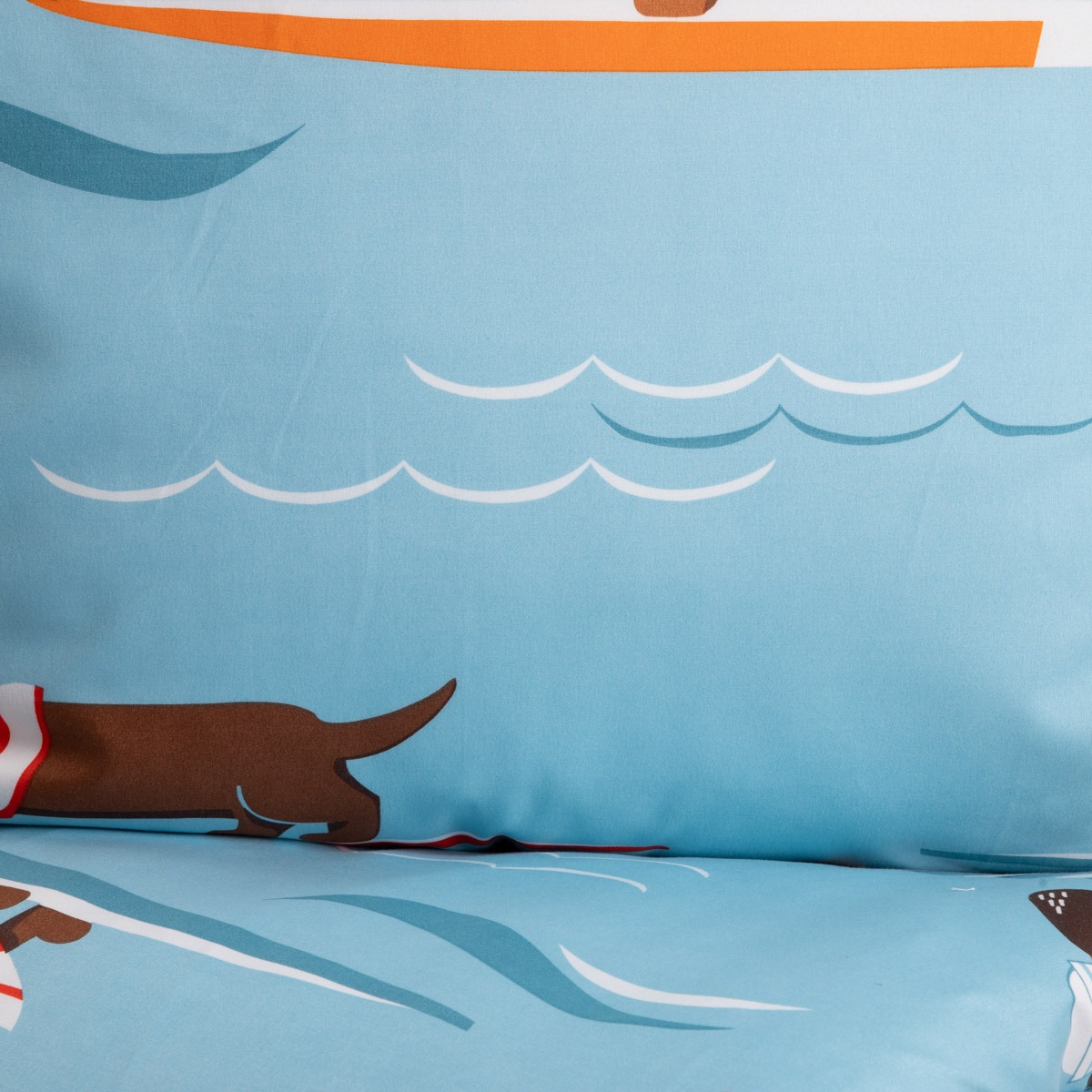 Вы ищете постельное белье, которое будет развлекать и в то же время обеспечивать комфортный сон? Постельное белье LONGO с очаровательным рисунком таксы на доске для серфинга идеально подходит для детей и любителей четвероногих питомцев. Веселая графика на фоне голубого неба и волн добавит веселья в любую спальню.