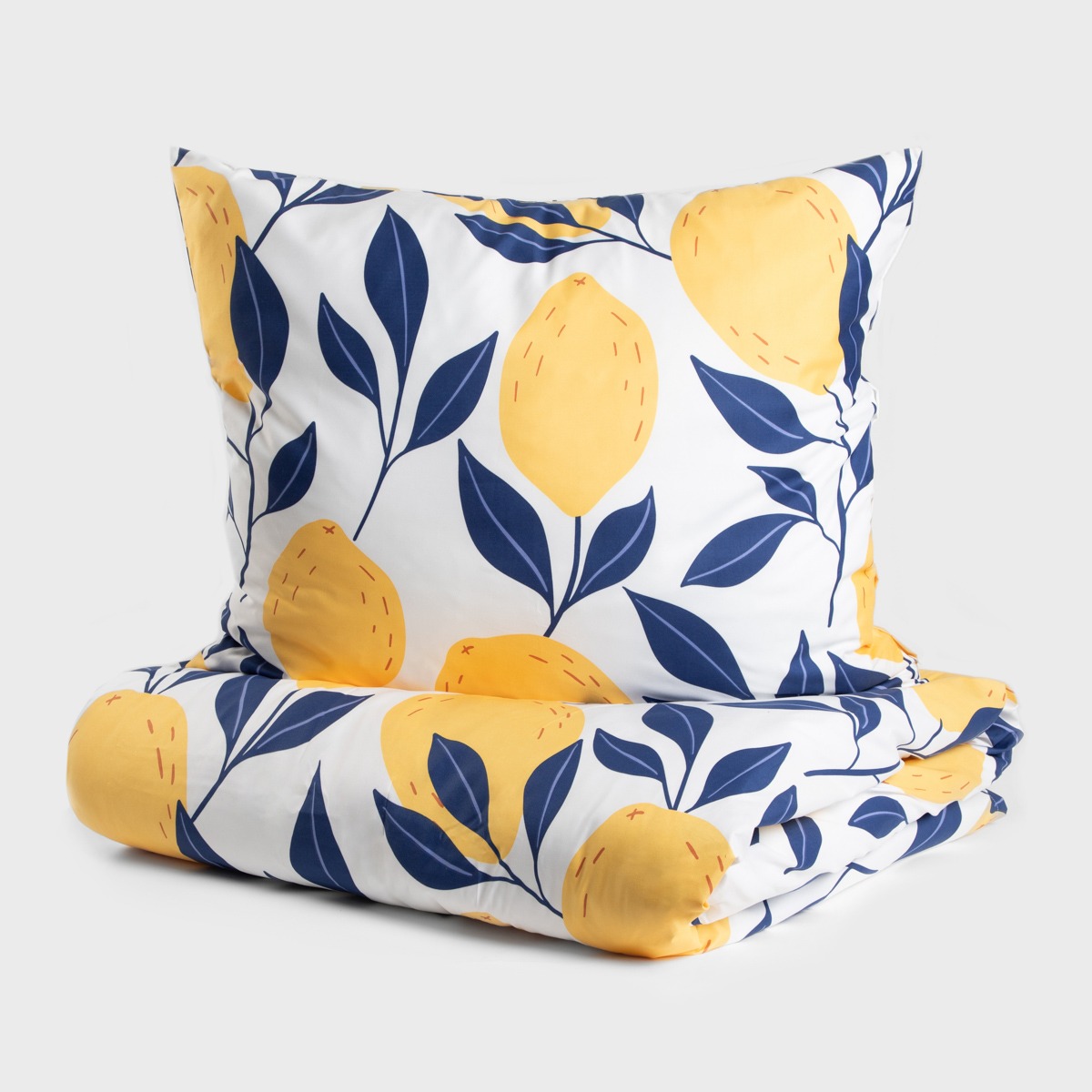 Постельное белье SIDRUM оживит ваш интерьер благодаря яркому рисунку из лимонов и изящных листьев в глубоком темно-синем оттенке. Сочные цвета придают постели неповторимый характер и летнюю энергию. Материал постельного белья приятен на ощупь, прост в уходе, обеспечивает комфортный сон и практичность в повседневном использовании.