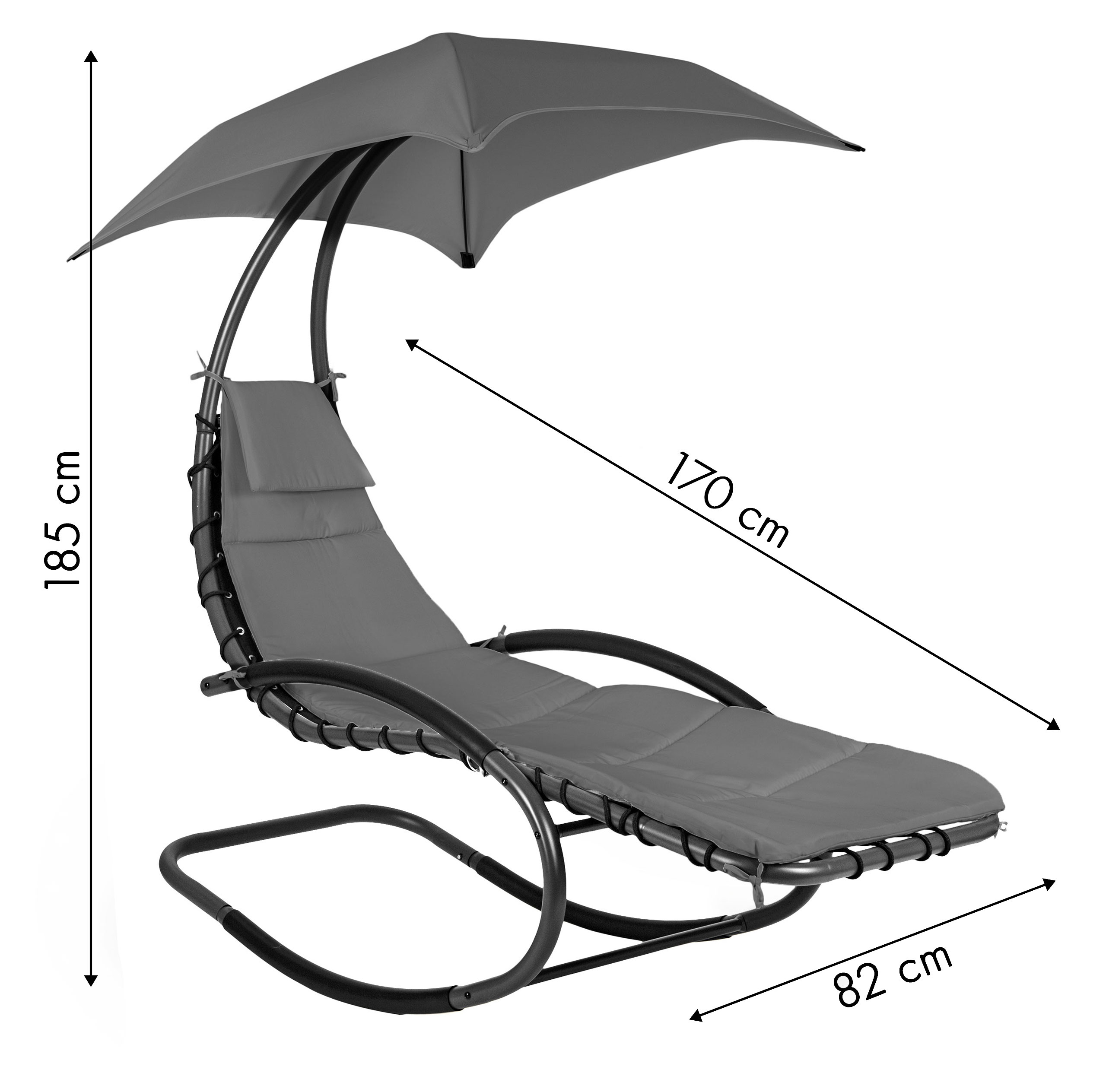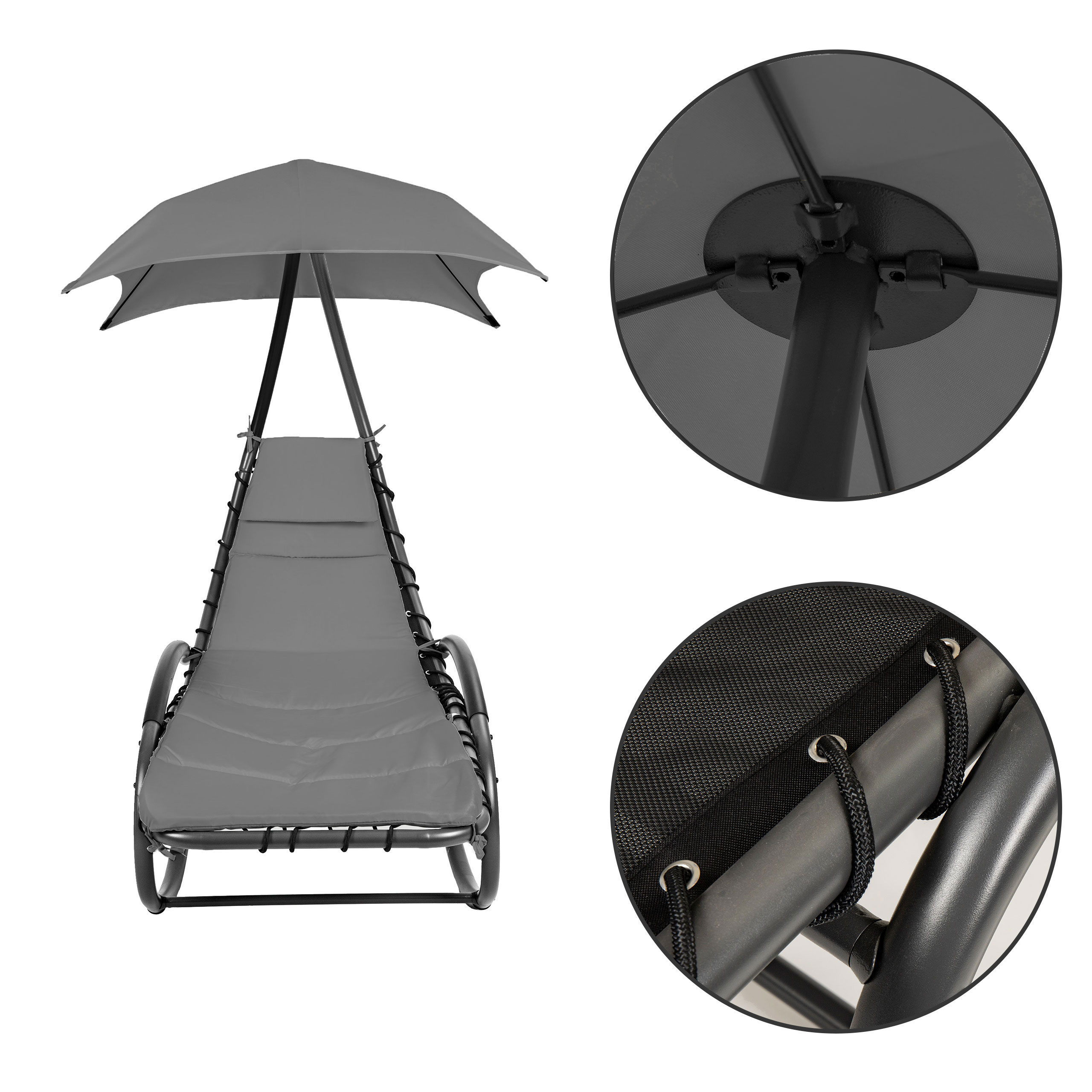 Большой регулируемый навес обеспечивает приятную тень в жаркие дни, а легкое покачивание способствует расслаблению на свежем воздухе.