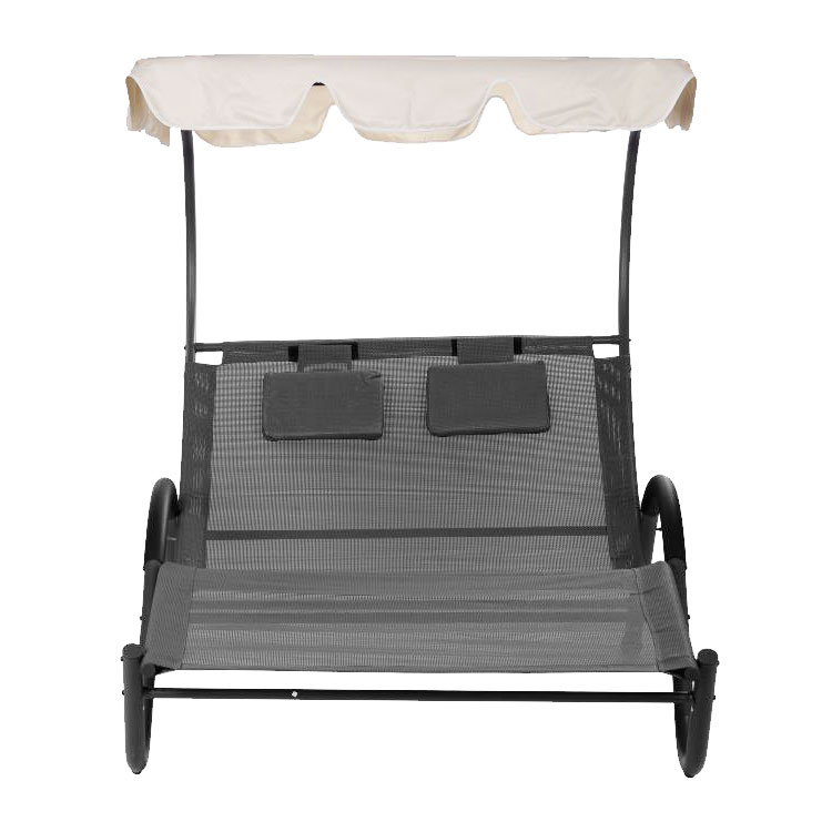 Своей устойчивостью и безопасностью шезлонг обязанстальному каркасу правильной формы. Большой регулируемый навес обеспечивает приятную тень в жаркие дни и защищает от ультрафиолетовых лучей, способствуя отдыху на свежем воздухе с любимым человеком. Высококачественная ткань, из которой изготовлена поверхность для лежания, является дышащей и водопроницаемой, что делает ее устойчивой к атмосферным воздействиям.