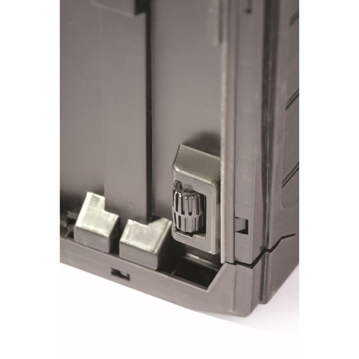 На крышке есть специальная ручка для крепления навесного замка. Это хорошее решение, если вы хотите защитить содержимое от доступа посторонних. Также полезно при хранении более дорогих инструментов.