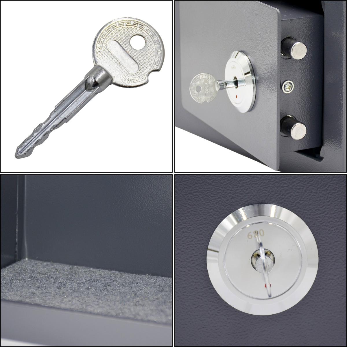 Сейф оснащен классическим ключевым замком для простой и надежной защиты. В комплект входят 3 ключа, что позволяет хранить его в разных местах и обеспечивает дополнительную безопасность в случае утери одного из ключей.