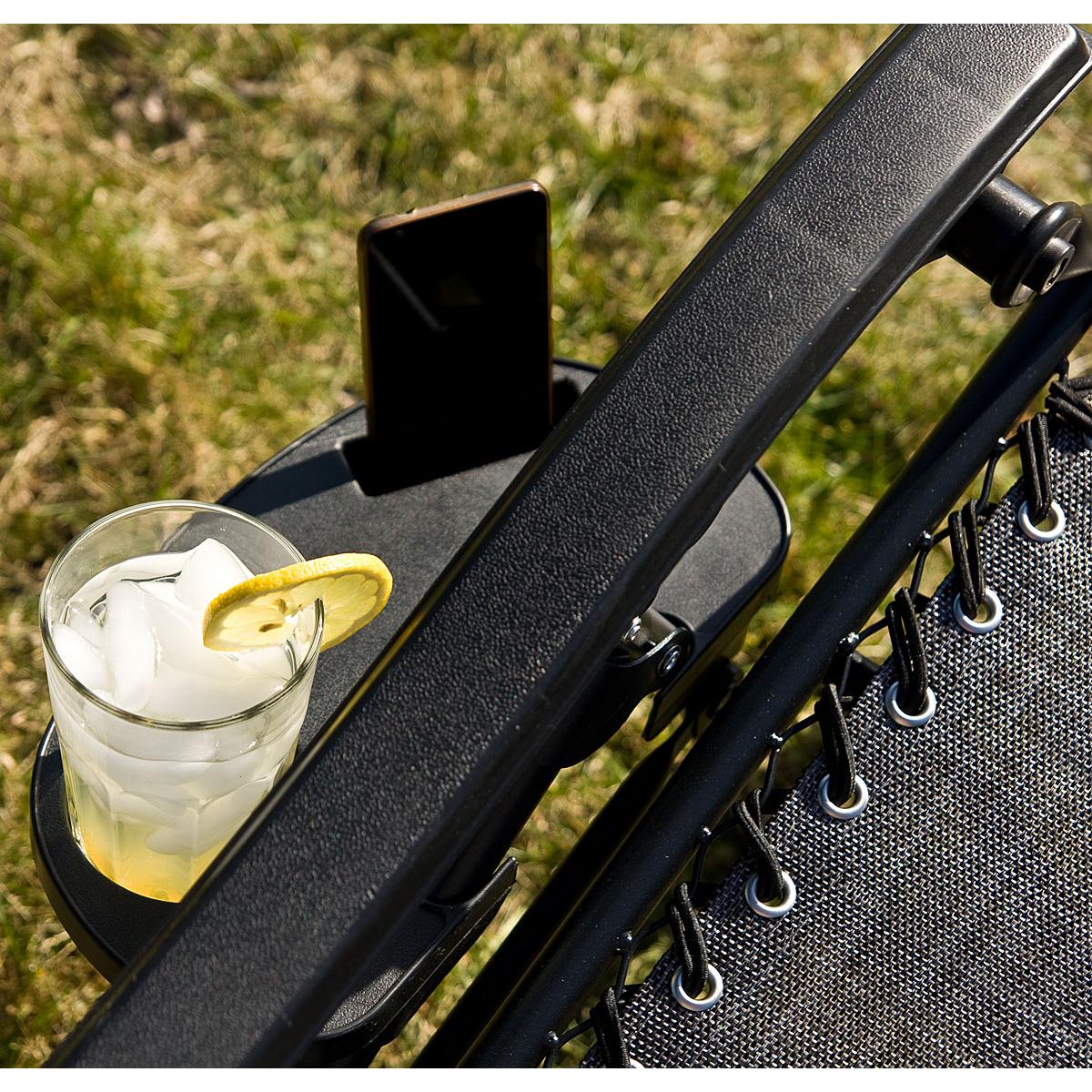 Мягкий подголовник позволит вам удобно положить на него голову и принять комфортное положение лежа. Боковой карман обеспечивает постоянный доступ к газете или любимой книге, а на столике можно поставить чашку кофе, сок или телефон. Каркас кресла изготовлен из прочной и долговечной стальной трубы диаметром 0,22 мм и толщиной 1 мм и выдерживает нагрузку до 120 кг!