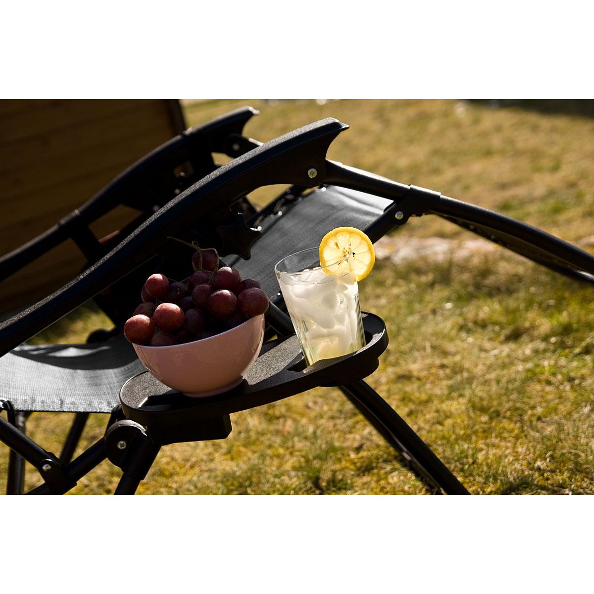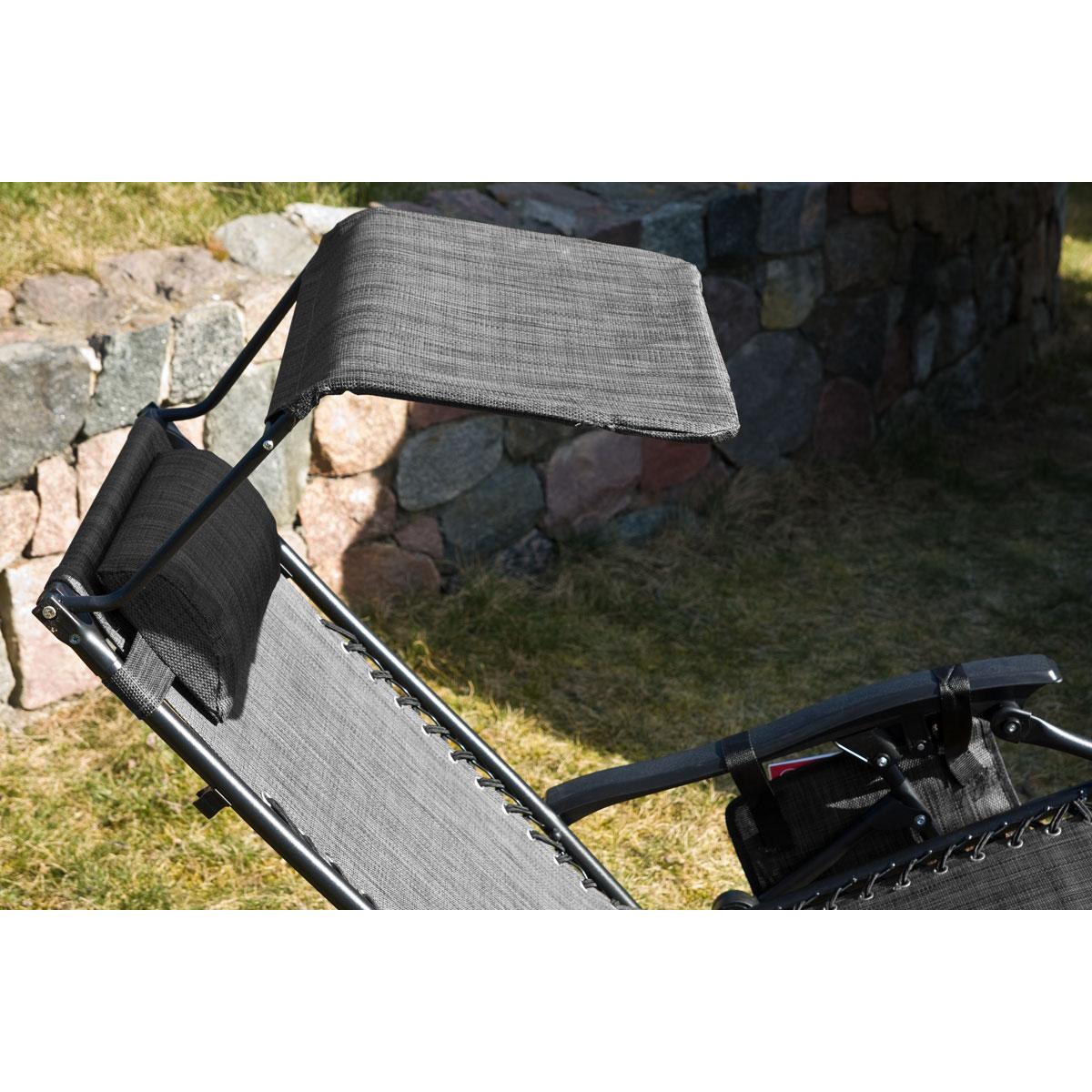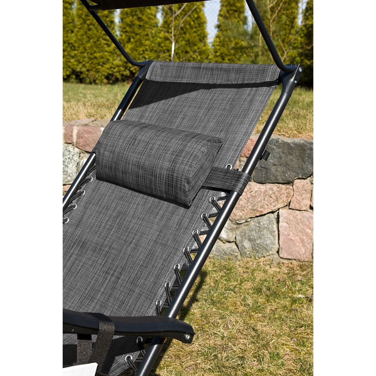 Мягкий подголовник позволит вам удобно положить на него голову и принять комфортное положение лежа. Регулируемый козырек обеспечит приятную тень или доступ к солнцу, боковой карман обеспечит постоянный доступ к газете или любимой книге, а столик позволит поставить чашку с кофе, сок или телефон. Каркас кресла изготовлен из прочных и крепких стальных труб и выдерживает нагрузку до 120 кг!