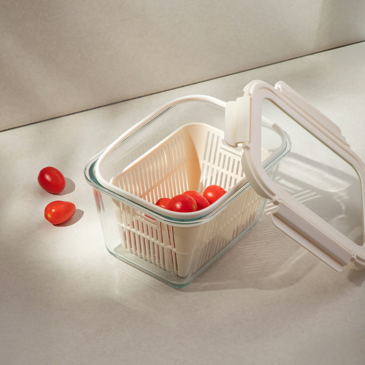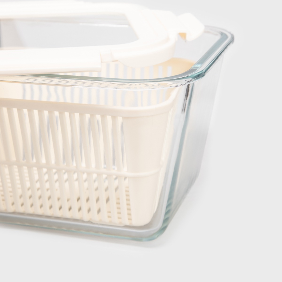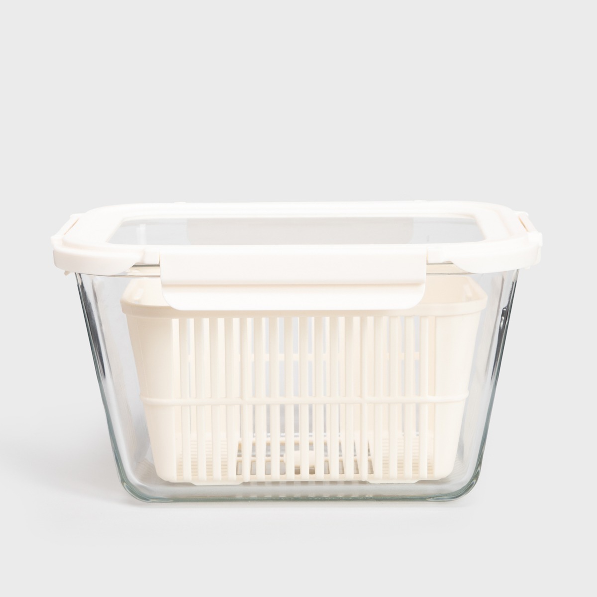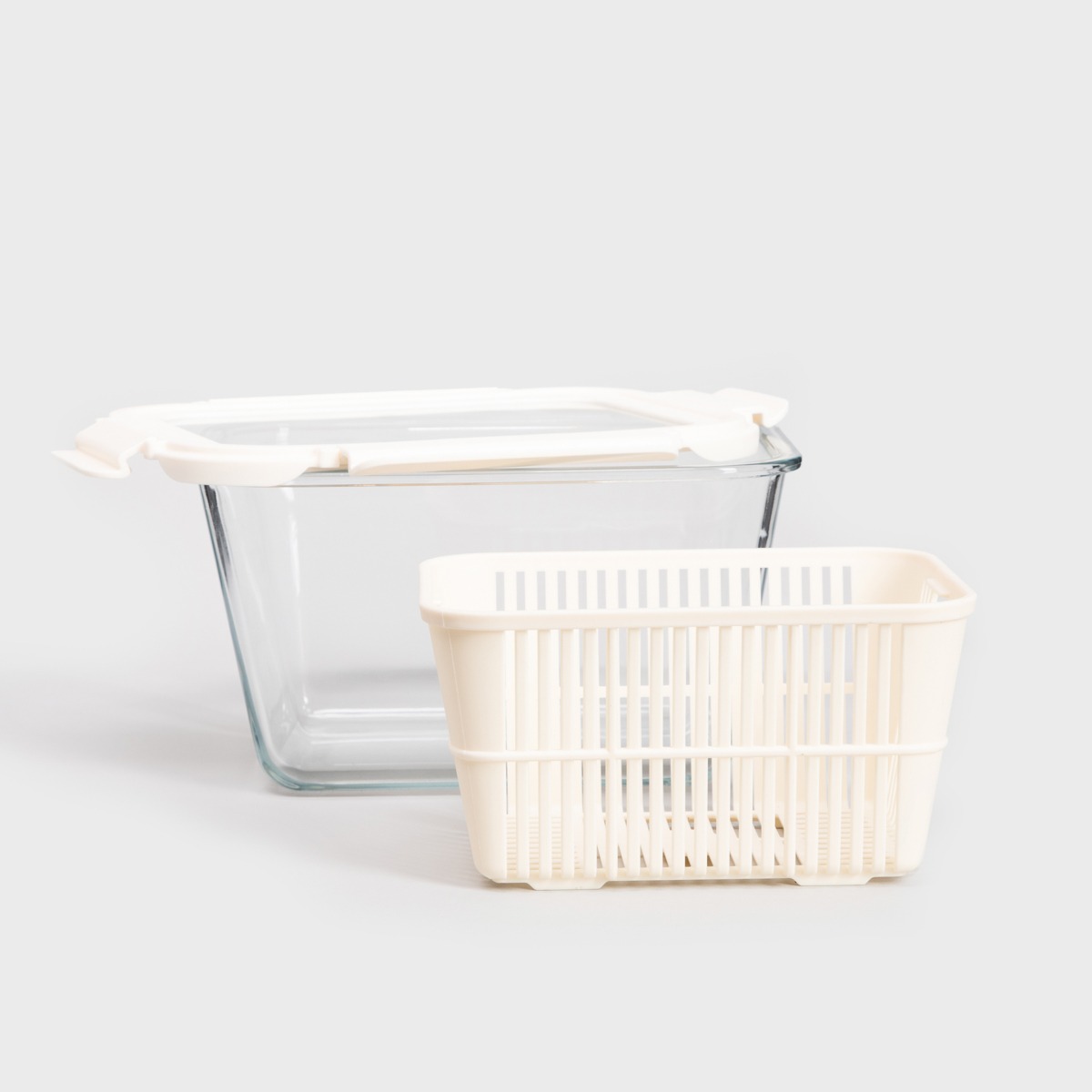 Контейнер NEGOZIO с корзиной — практичное решение для любой кухни. Стеклянная чаша с прозрачными стенками позволяет контролировать содержимое, а внутренняя вставка с отверстиями — удобно сливать и хранить продукты без контакта с водой. Идеально подходит для холодильника, стола или для того, чтобы взять с собой.