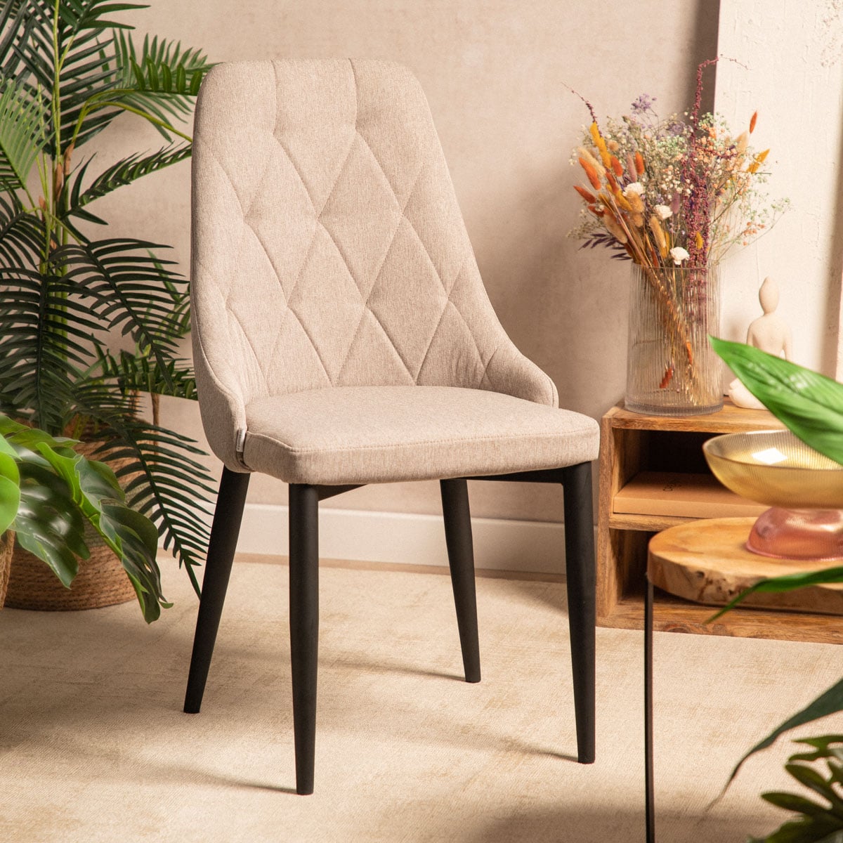 Ищете удобное и в то же время стильное кресло? Кресло HOMLA LOUIS QUILTER точно не разочарует ваши ожидания! Он изготовлен из высококачественных материалов, которые обеспечивают его долговечность и прочность при ежедневном использовании. Сиденье стула обито приятной на ощупь тканью, которая украшена стильной стежкой на спинке. Бежевая обивка идеально сочетается с черными ножками, создавая элегантное современное сочетание.