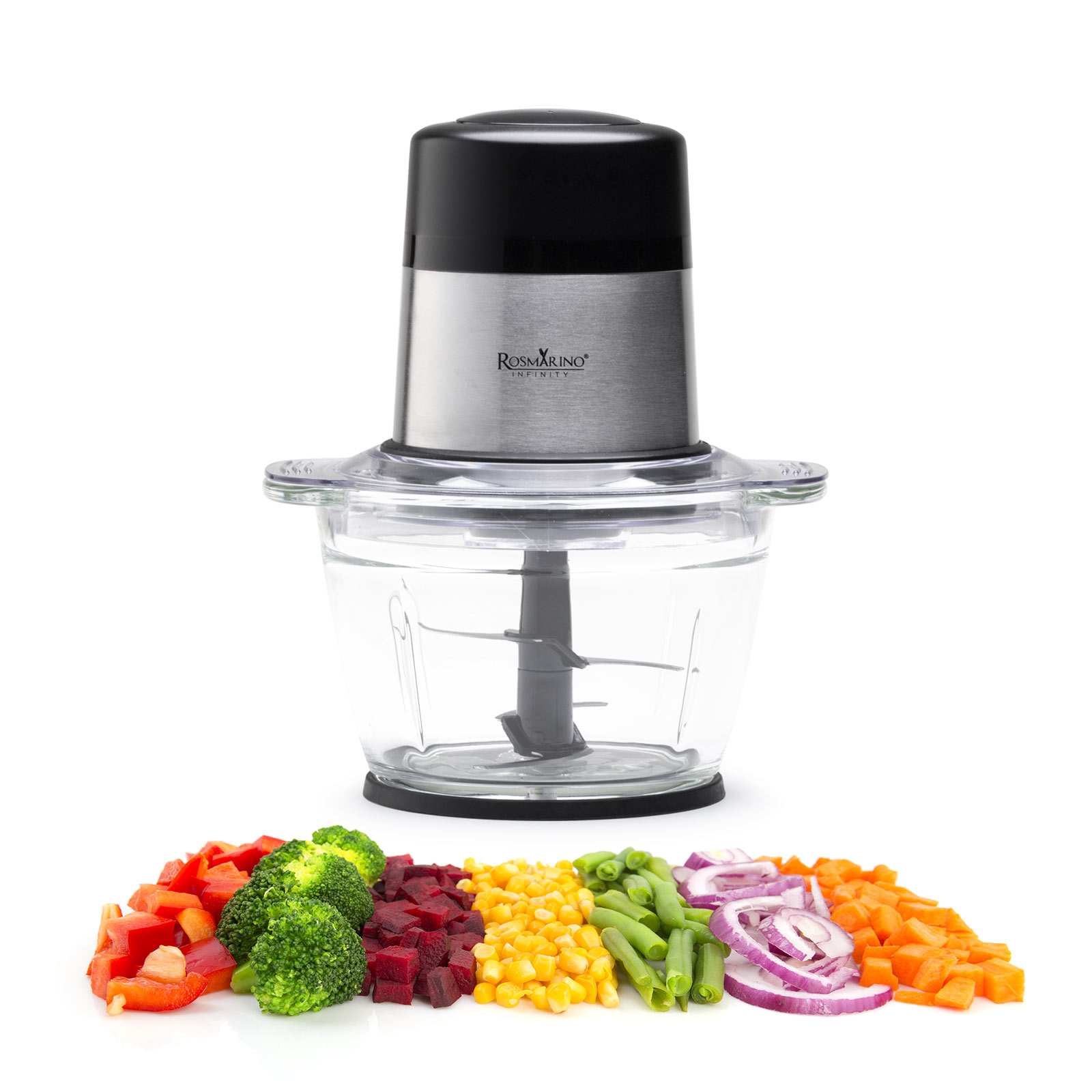Чоппер для продуктов Rosmarino Infinity станет вашим новым помощником для измельчения всех видов продуктов, даже самых твердых. Лезвия из нержавеющей стали позволят вам нарезать и измельчить самые разные овощи, фрукты, мясо, хлеб, орехи или лед! Мощность двигателя 300 Вт, 2 скорости и дополнительная функция импульса порадуют вас легким и здоровым приготовлением пищи. Во вместительной стеклянной чаше объемом 1 литр вы сможете с легкостью нарезать продукты для всей семьи. Она также идеально подходит для приготовления нескольких детских блюд в одной чаше. Минималистичный дизайн в черном цвете и inox порадует всех любителей элегантности на кухне.