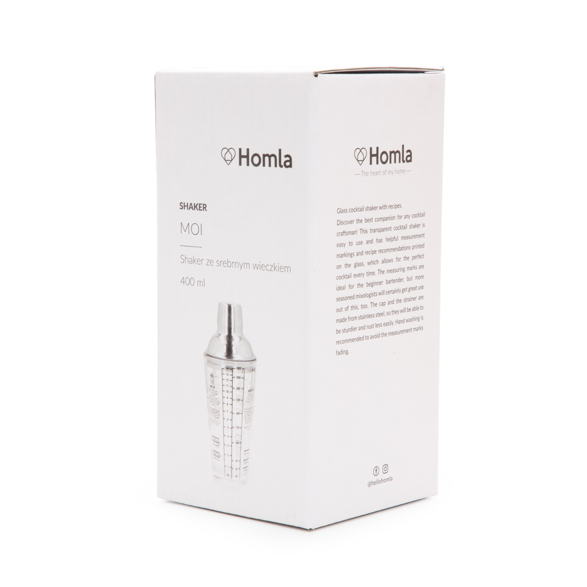 Шейкер MOI представляет собой изделие, состоящее из трех частей. Его основа — прозрачная бутылка. На ней изображены шесть рецептов вкусных напитков, которые можно приготовить с помощью именно этого шейкера. Рядом с ней также находится мерный стаканчик, чтобы было легче определить, сколько мл напитка находится внутри. Еще одна деталь изделия — серебристая крышка, которая плотно закрывает шейкер благодаря силиконовой резинке внутри. Крышка имеет съемную головку с декоративным логотипом «Homla» на ней. Емкость шейкера составляет 0,4 литра.