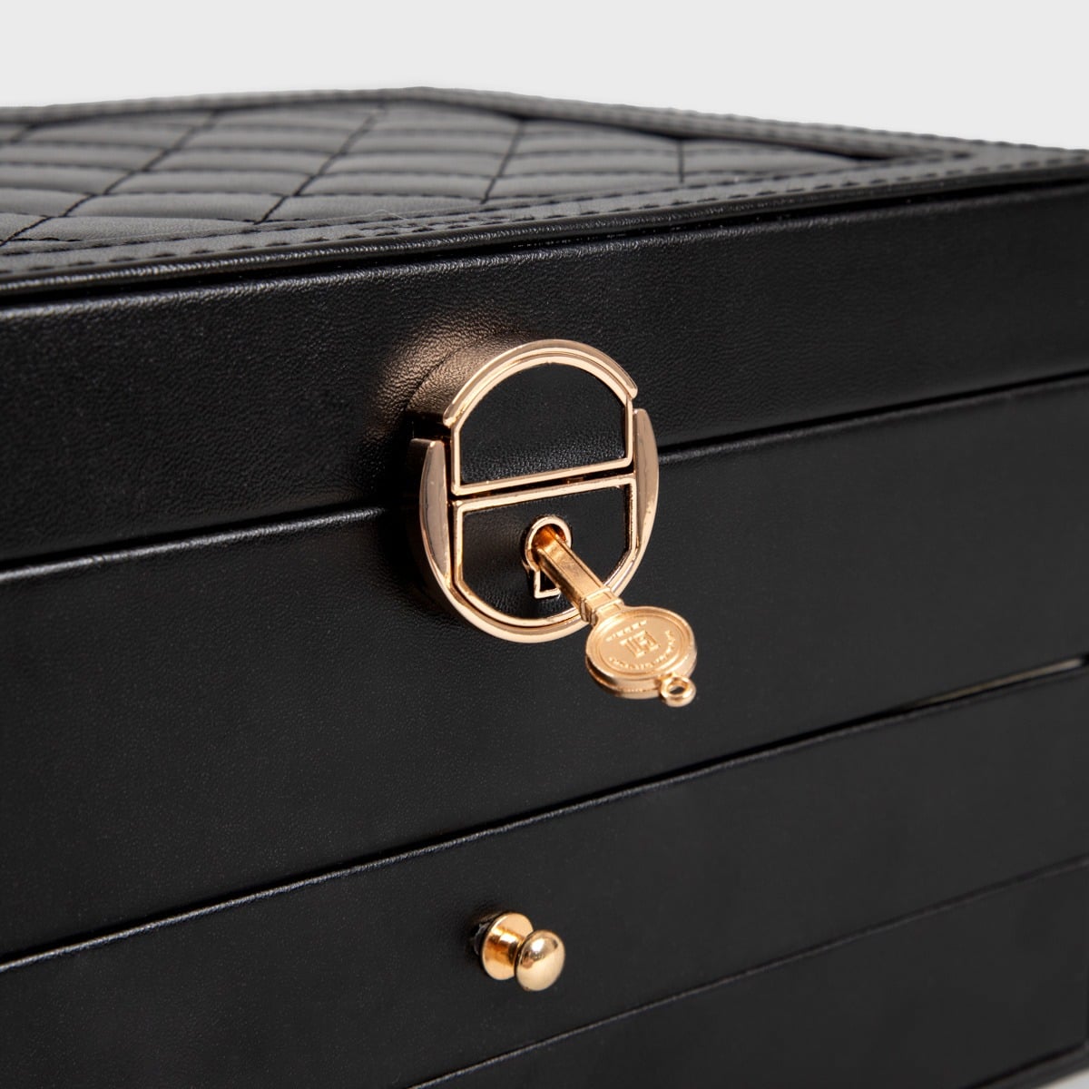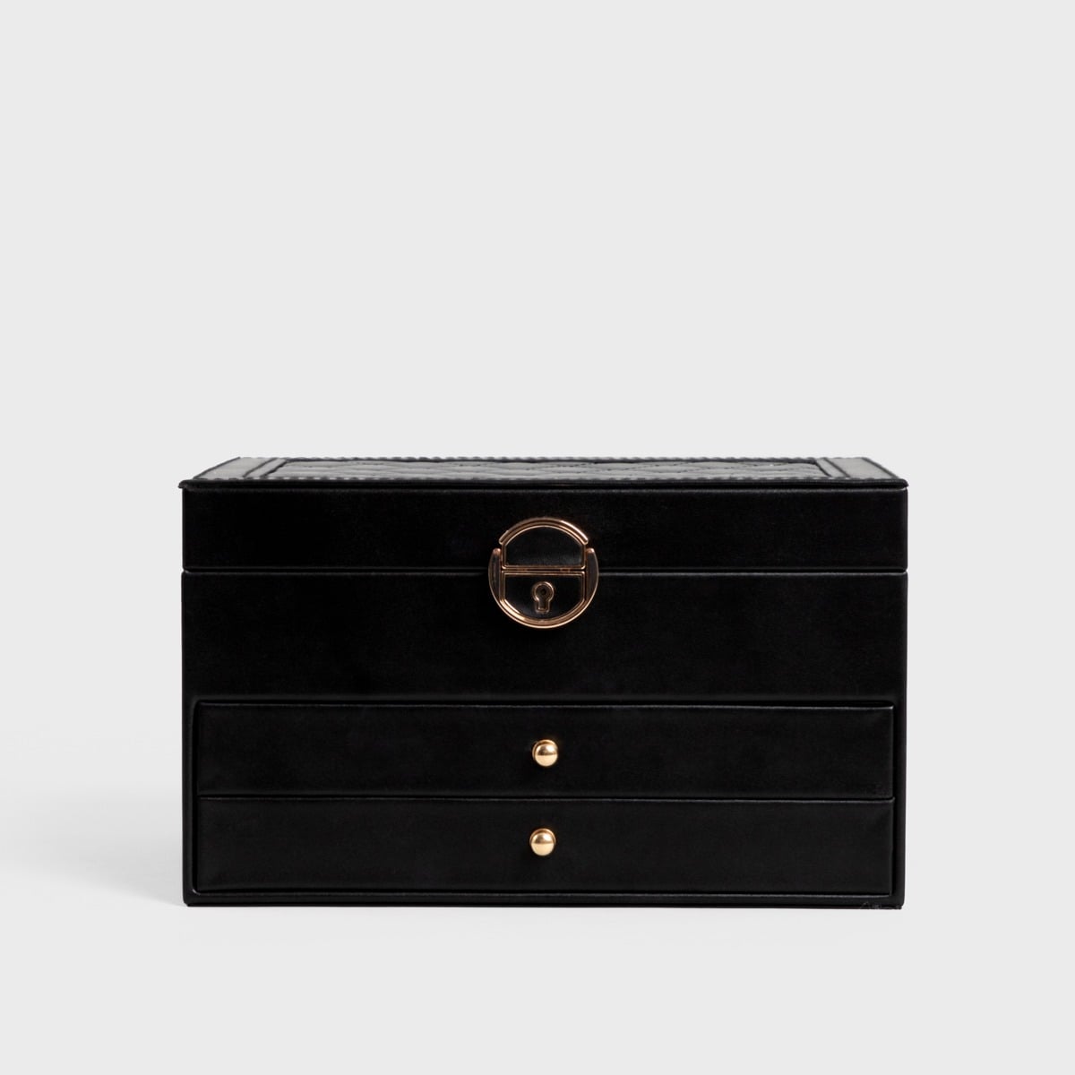 Шкатулка для украшений VIRELLO — это сочетание стиля и элегантности. Черная отделка со светлым велюром внутри придает ей роскошный вид. Благодаря многочисленным отделениям и двум выдвижным ящикам вы сможете легко упорядочить ваши кольца, серьги, браслеты или часы. Дополнительный замок с ключом обеспечит сохранность ваших сокровищ.
