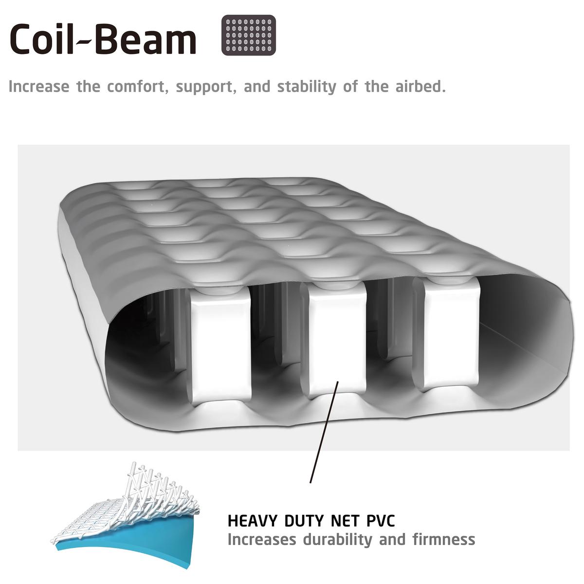 Конструкция Coil Beam — идеальное решение для тех, кому надувной матрас нужен не только для комфорта, но и для долговечности и стабильности. Благодаря вертикальным балкам матрас обеспечивает отличную поддержку и комфорт во время использования. Идеально подходит для прогулок, дома, в саду или на приусадебном участке.