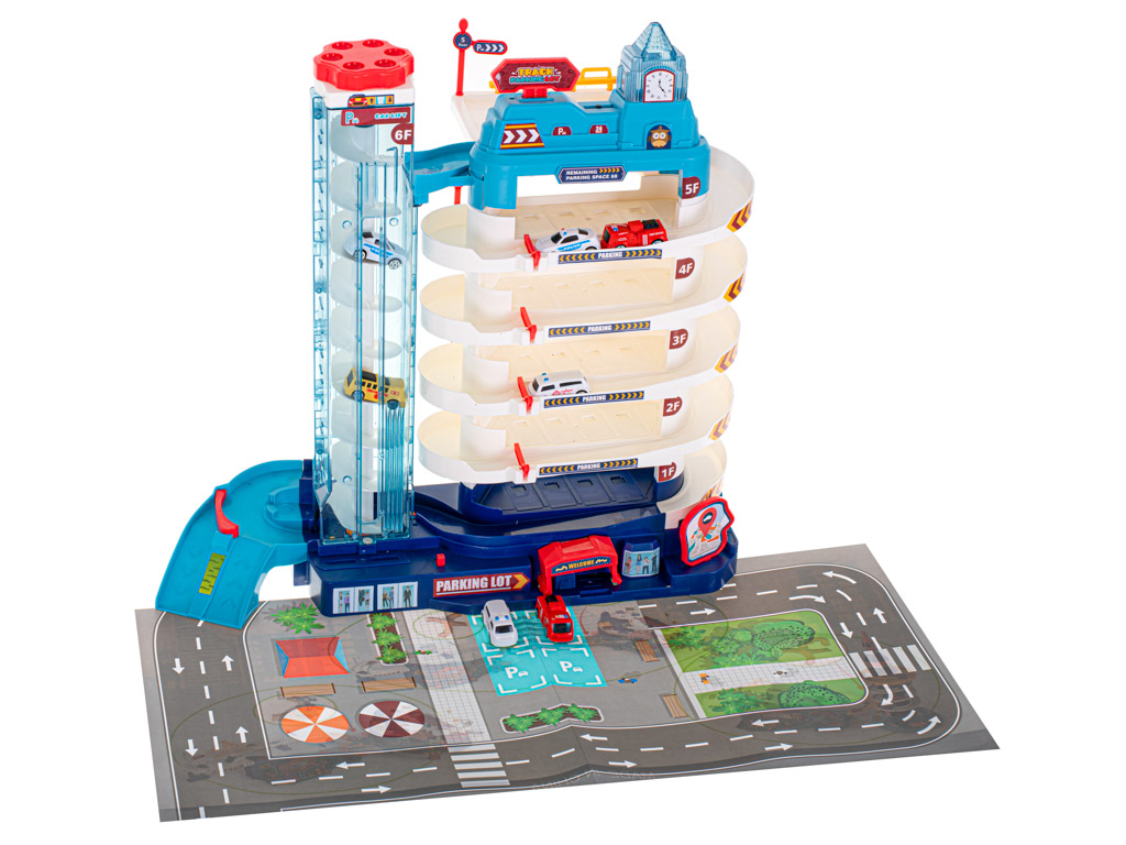 На парковке есть пять уровнейдля парковки автомобилей, которые вы найдете в наборе. На самый верх парковки машинки могут подняться на автоматическом лифте.