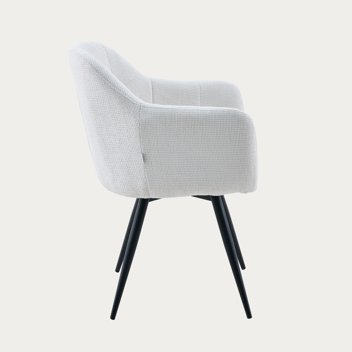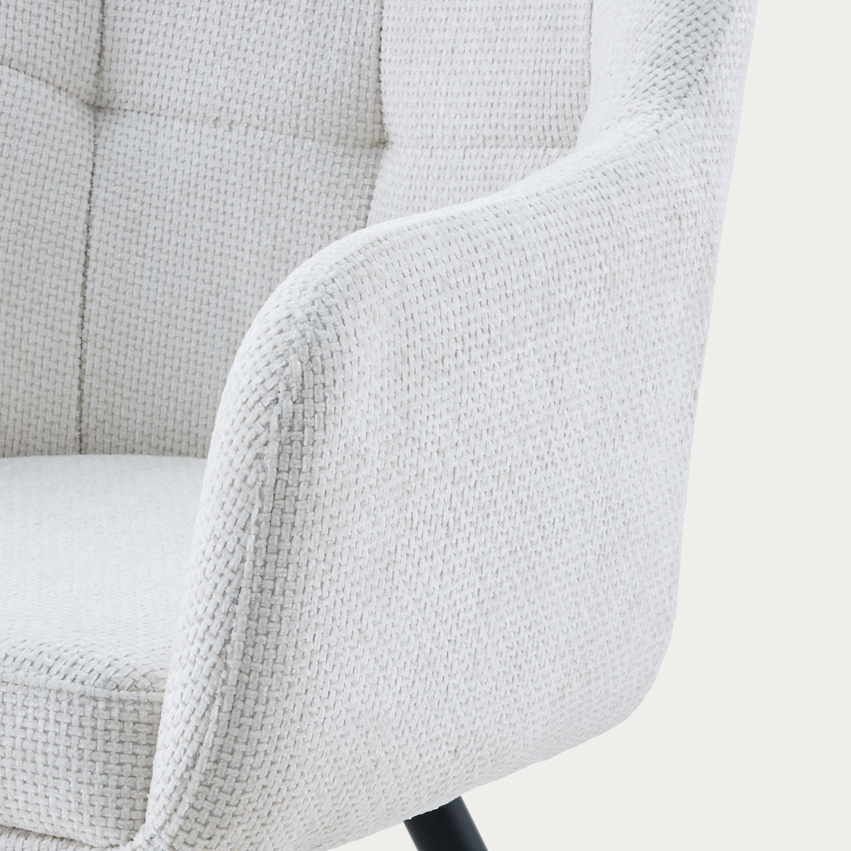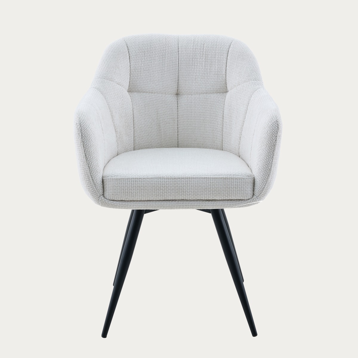 COMODO chair in ecru fabric 59x58x84 cm 180° Rebound Swivel Chair 1. Seat&Back: White Fabric#WY91-1, similar stitching 2. Leg: Black powder coating, dia32-16mm, T: 1.2mm 3. Size: (43-59)*58*84cm, SH: 49cm, SD: 46cm 4. Packing: 2pcs/ctn
