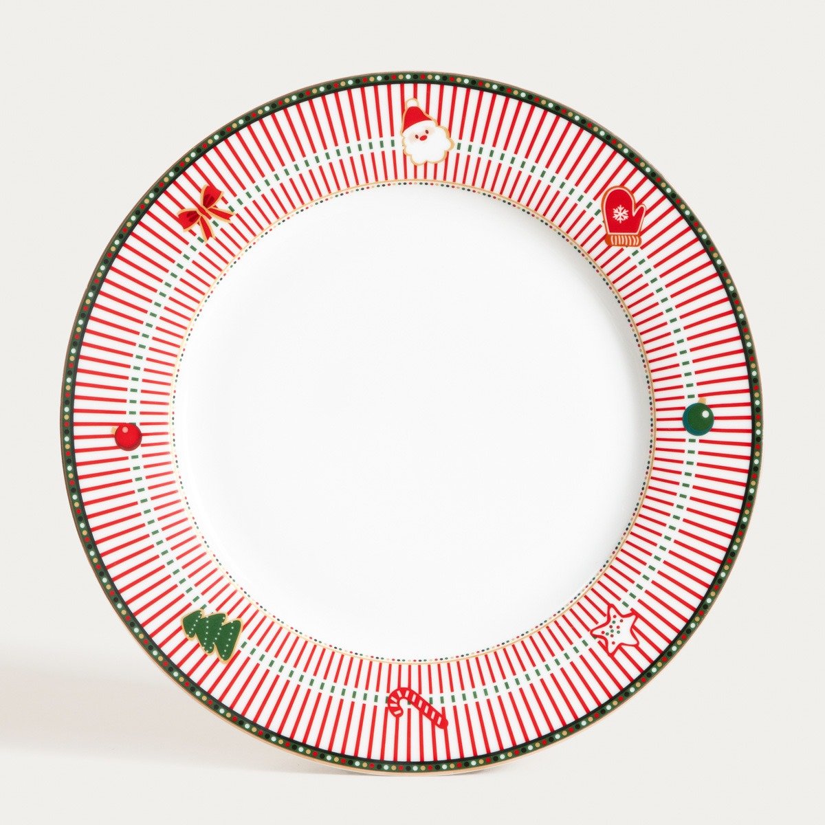 Фарфоровая обеденная тарелка имеет очаровательный дизайн с полосками и популярными рождественскими мотивами — на ней вы найдете елку, Деда Мороза, леденцовую трость или баулы. Это не только практичное блюдо для подачи еды, но и красивое украшение вашей посуды.