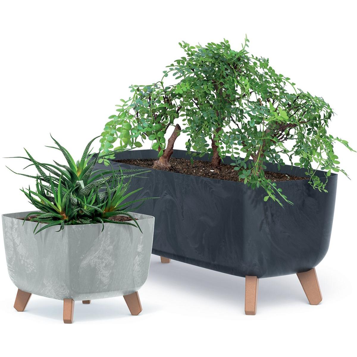 Цветочный горшок Gracia Square Concrete Effect имеет форму округлого квадрата с современной отделкой и текстурой бетона, легкую форму, приподнятую на ножках со структурой, напоминающей дерево.