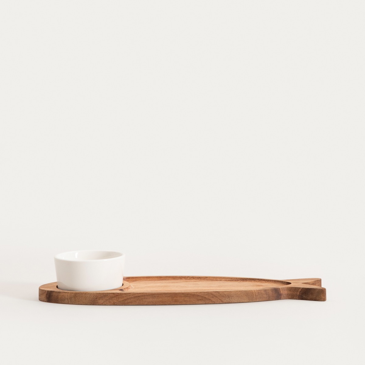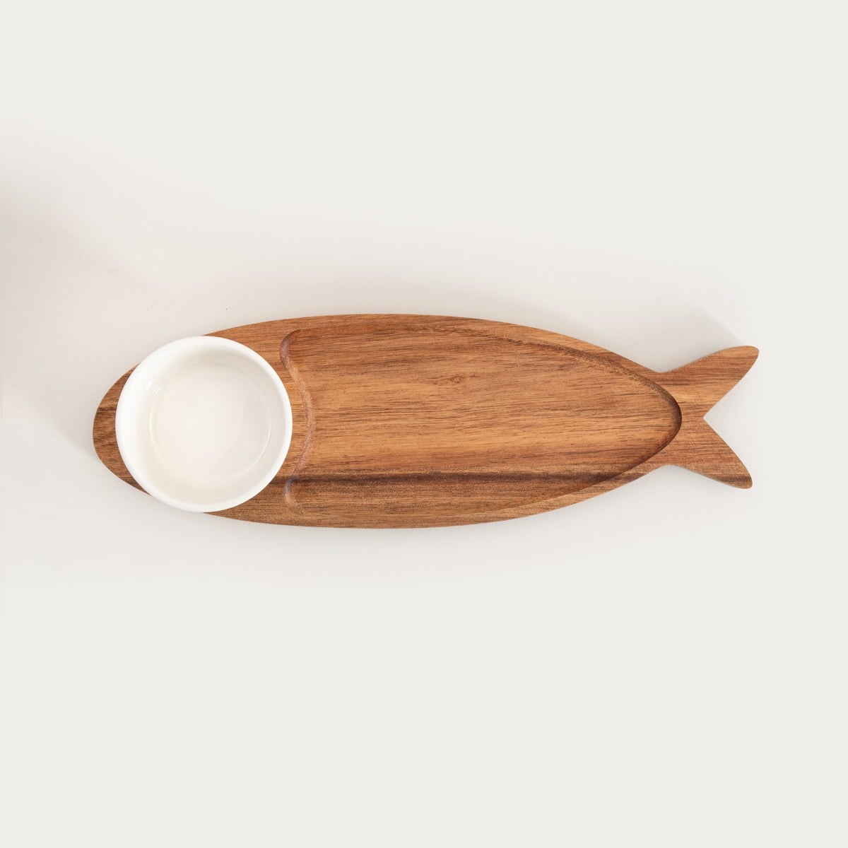 Набор MOOKA создан для тех моментов, когда важны детали и сервировка. Деревянная доска в форме рыбы придает сервировке легкость и естественность, а фарфоровая миска тонко завершает целое. Даже простым закускам найдется уникальное место, чтобы отпраздновать совместную трапезу.