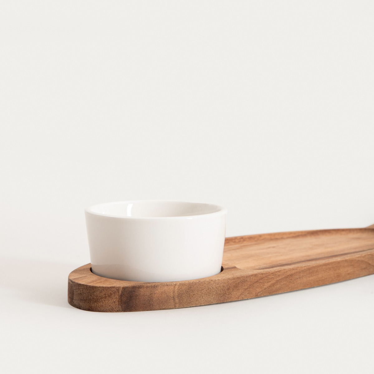 Доска изготовлена из натурального дерева, которое отличается долговечностью и уникальным рисунком текстуры. Фарфоровая чаша гладкая, эстетичная и легко моется. Набор предназначен для сервировки — дерево следует мыть вручную и не замачивать надолго.