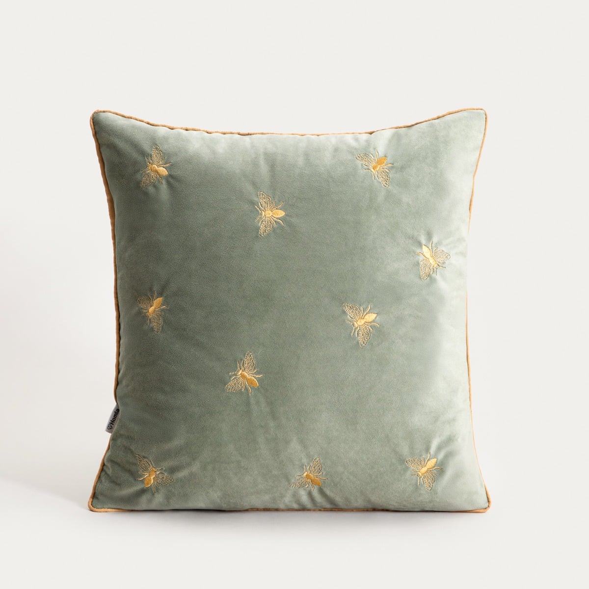 Фисташковая велюровая наволочка с вышитыми пчелами 45 x 45 см