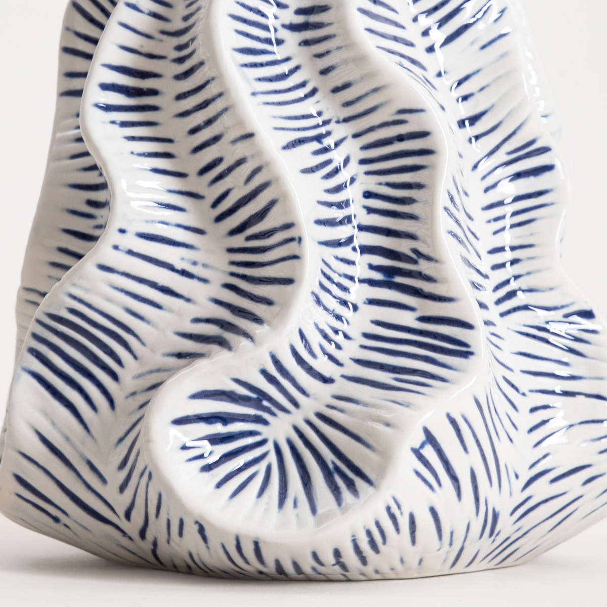 - Контрастный узор в оттенках белого и темно-синего подчеркивает декоративный характер вазы