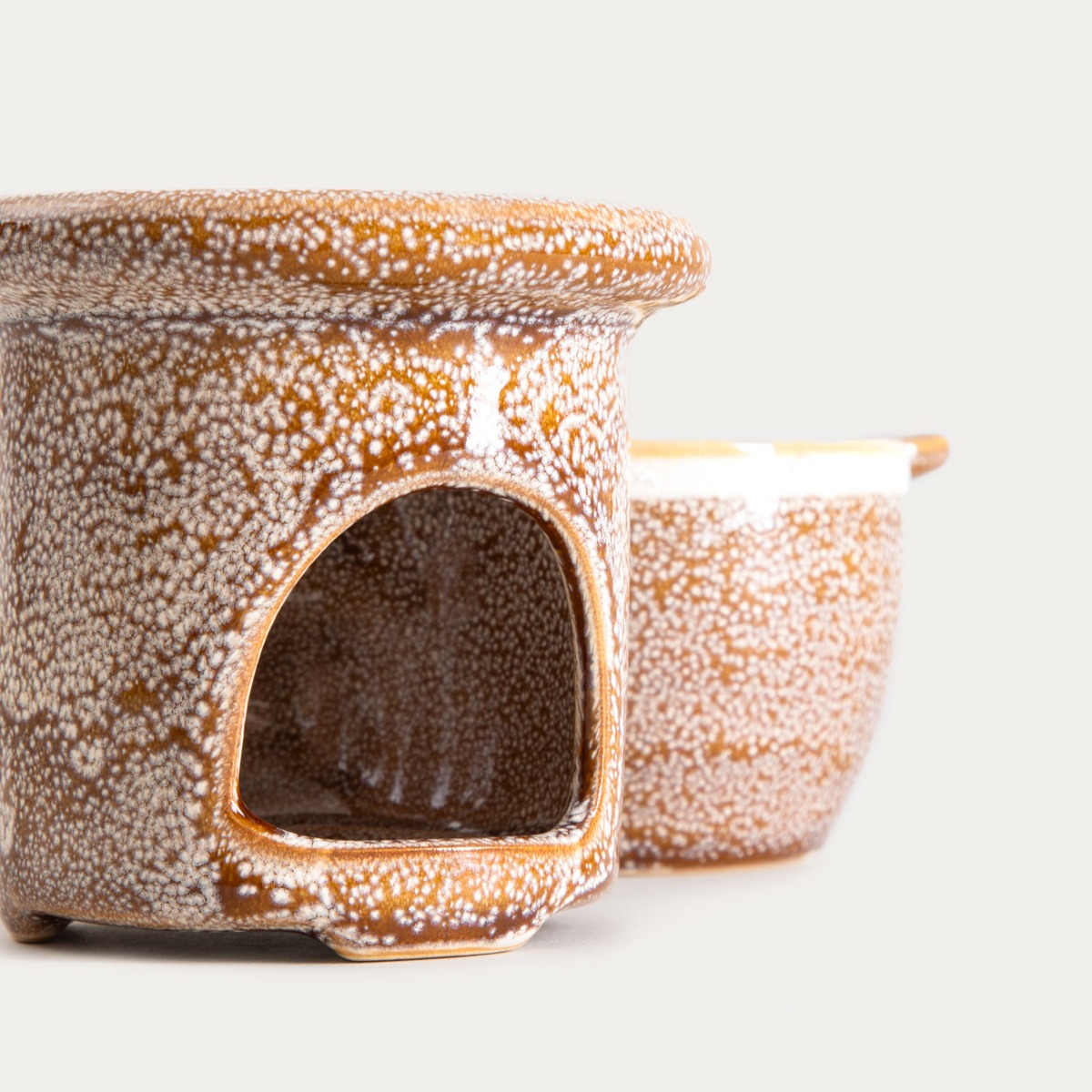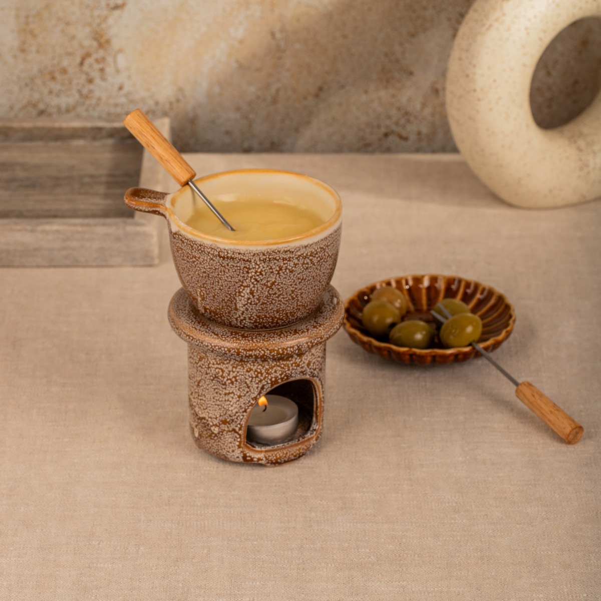 Набор KROS — идеальный выбор для любителей сладкого и соленого фондю. Керамический сосуд в деревенском стиле, установленный на декоративной подставке с подогревателем, создает уютную атмосферу во время посиделок с семьей и друзьями. Он отлично подходит для шоколада, сыра или соусов и, благодаря своим компактным размерам, впишется в любую кухню и стол.