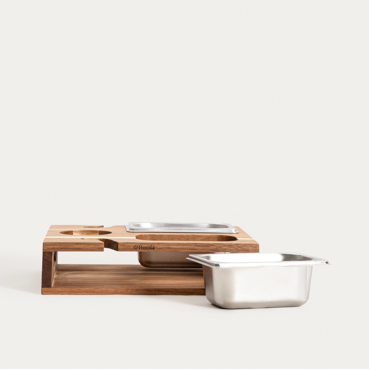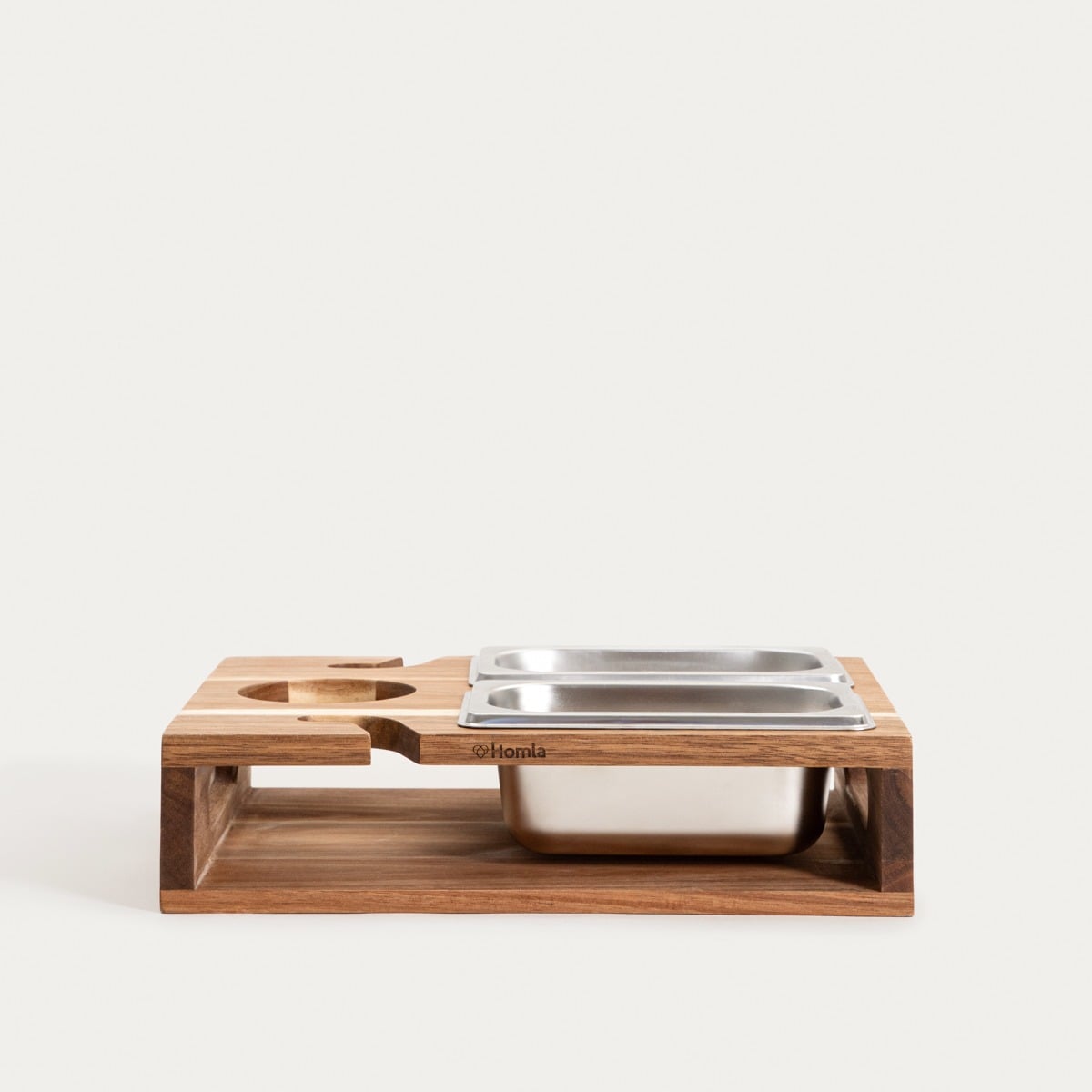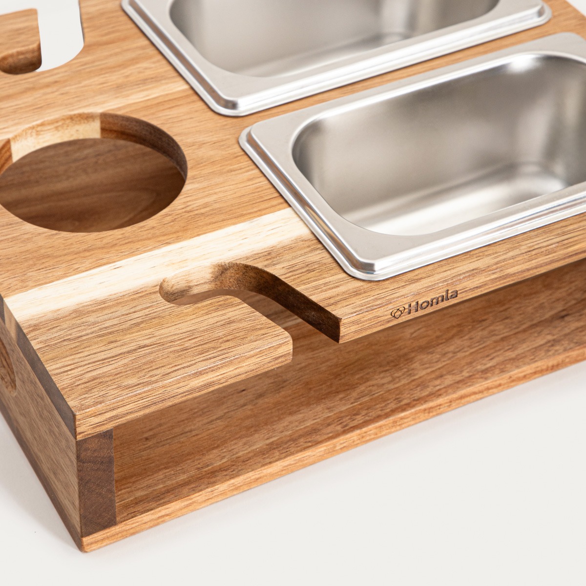 Сервировочный набор EDMORE 31×25 см изготовлен из высококачественной древесины и прочной нержавеющей стали. Дерево отвечает за устойчивость и естественный внешний вид, а стальные чаши удобны в использовании.